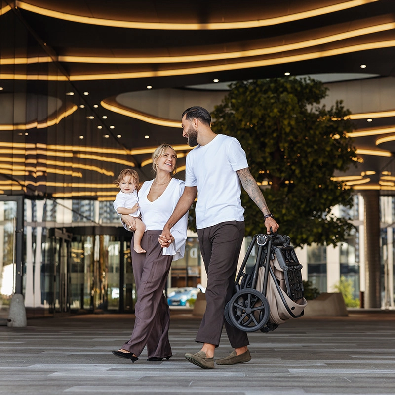 MUUVO One 2w1 to przemyślany wózek od narodzin po okres niemowlęcy i dalej. Dzięki kompaktowym wymiarom po złożeniu oraz automatycznemu składaniu jedną ręką łatwo poradzisz sobie w komunikacji miejskiej, windzie czy bagażniku auta. Wytrzymałe piankowe koła z wyborem miękkiego lub twardego trybu amortyzacji zapewniają płynną jazdę na bruku i parkowych alejkach.