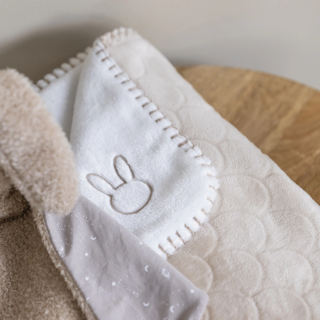 Praktyczny wymiar 75 × 100 cm jest idealny do łóżeczka, wózka i fotelika samochodowego. Wysoka jakość wykonania i wytrzymała tkanina poliestrowa gwarantują długą żywotność i łatwą pielęgnację – wystarczy prać w 30 °C.