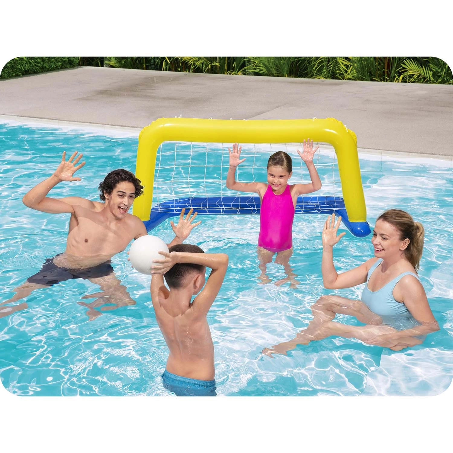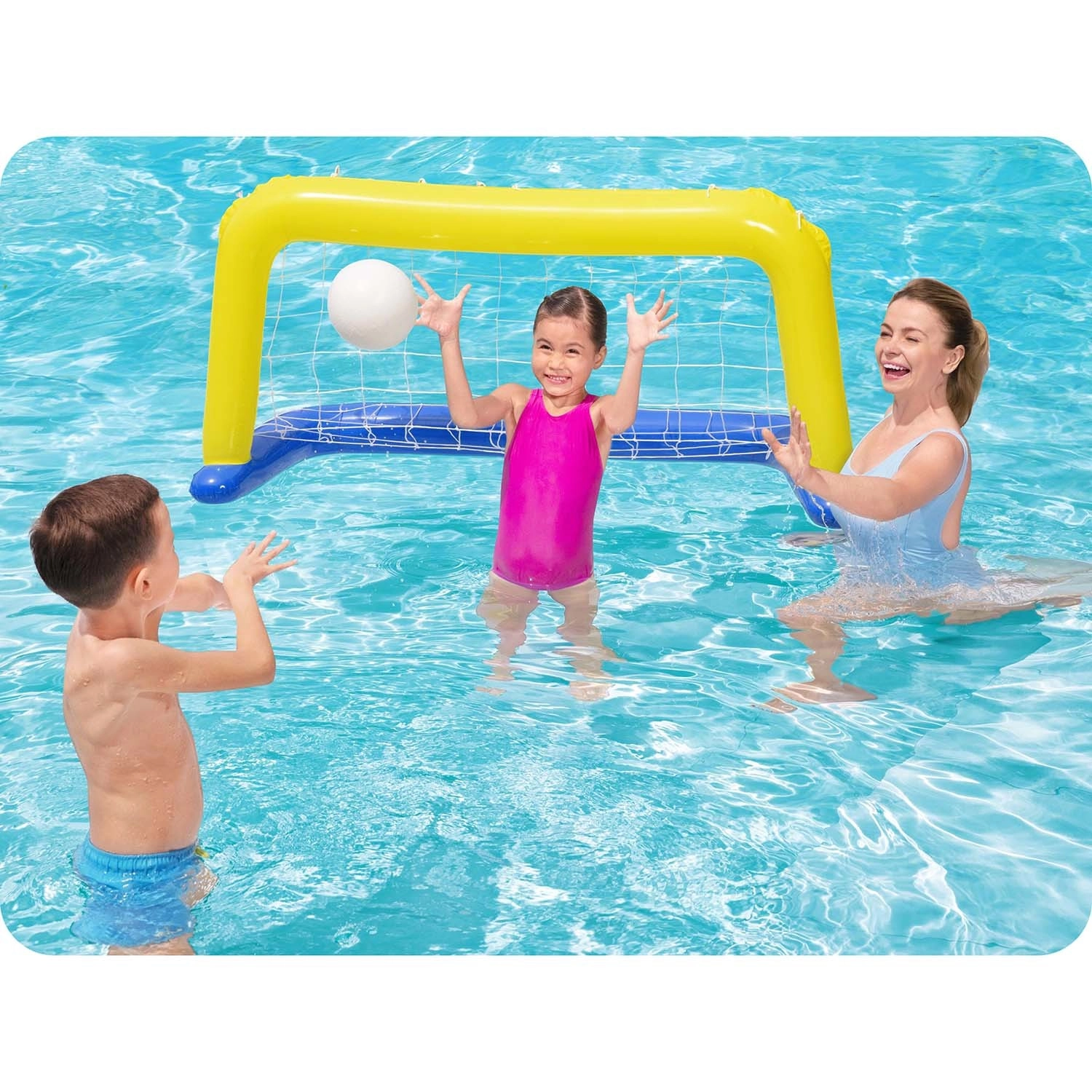 Stabilna żółto-niebieska konstrukcja z białą siatką gładko unosi się na powierzchni wody i doskonale nadaje się do piłki wodnej lub rzutów w basenie.