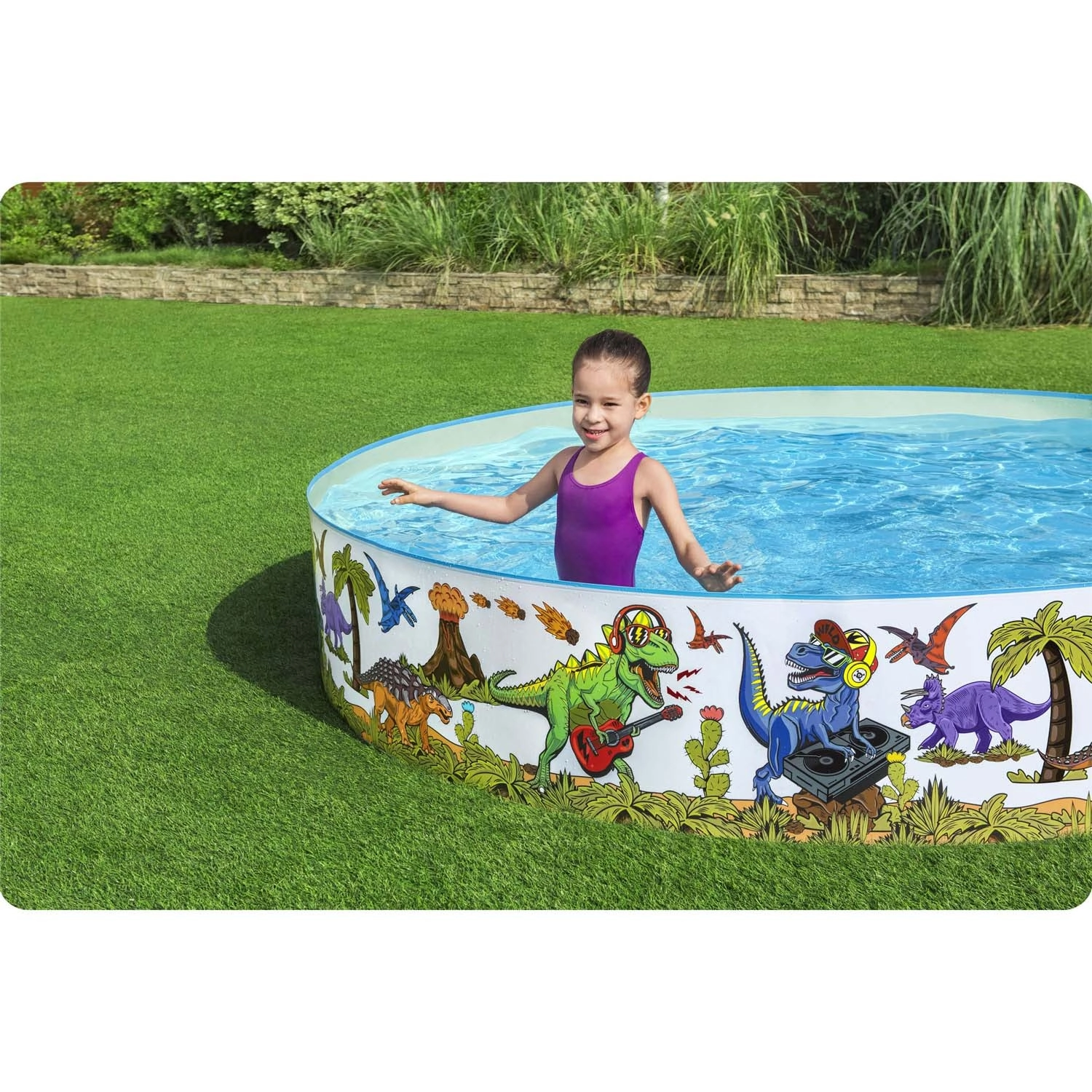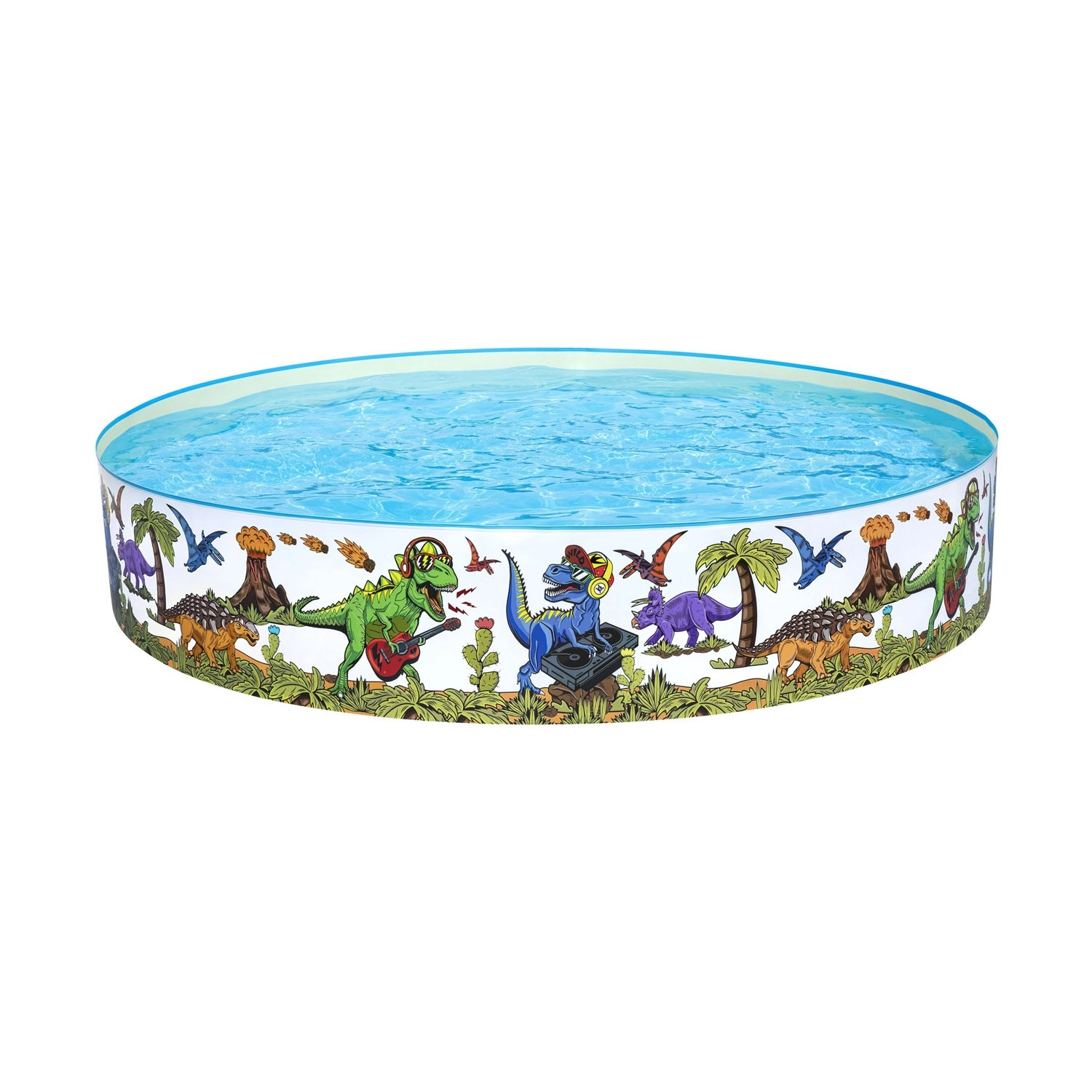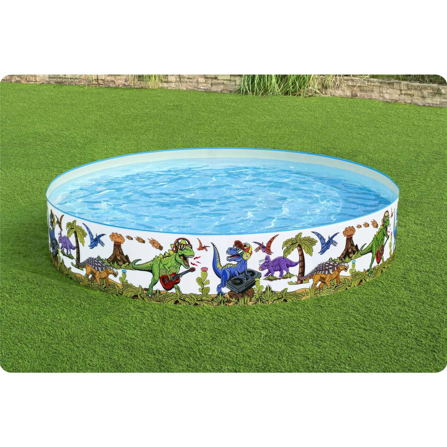 Kolorowe ilustracje dinozaurów wokół całego obwodu zamienią Twój ogród w strefę radości i zachęcą dzieci do ruchu oraz wodnej zabawy.