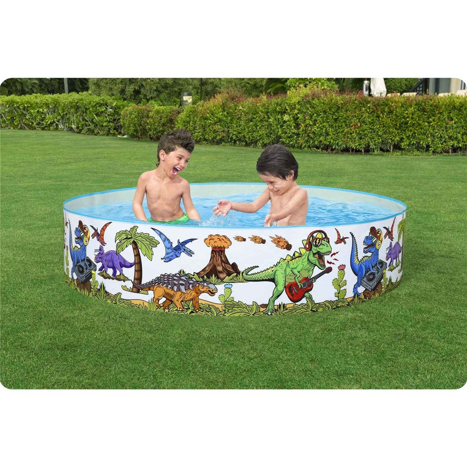 Rodzinny ogrodowy basen Bestway Dinosaur Fill 'N Fun to świetny wybór na upalne dni. Solidne ścianki z PVC i winylowe dno zapewniają stabilność i długą żywotność, a kolorowa grafika z dinozaurami tworzy radosną atmosferę do codziennych wodnych harców.
