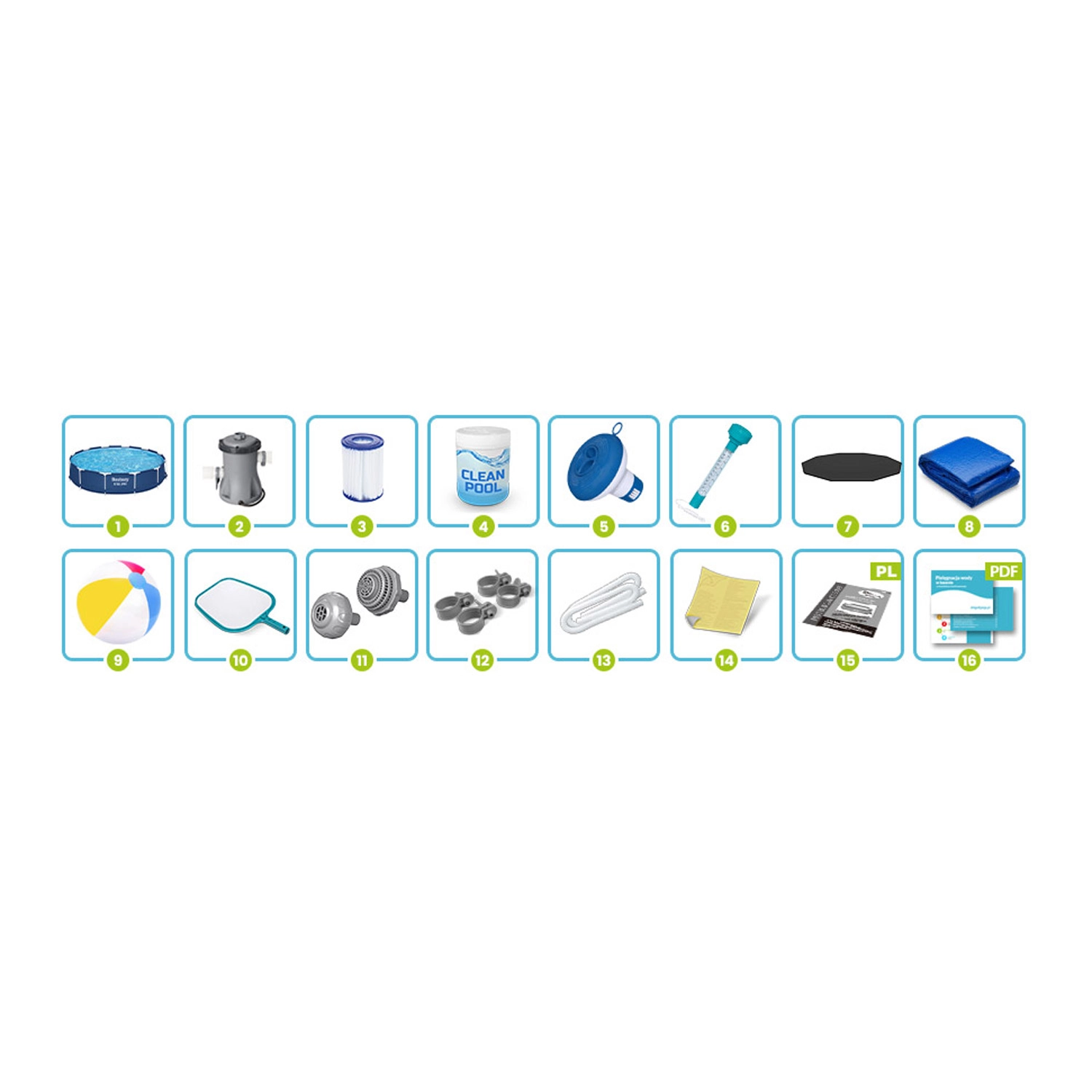- Basen, pompa filtrująca, filtr kartuszowy, węże, sitka i opaski do pompy, pływak do chemii, 25× multitabletka 20 g, termometr, siatka do zanieczyszczeń, pokrywa, mata pod basen, dmuchana piłka, łatka naprawcza, instrukcja