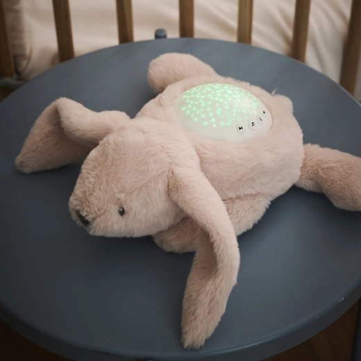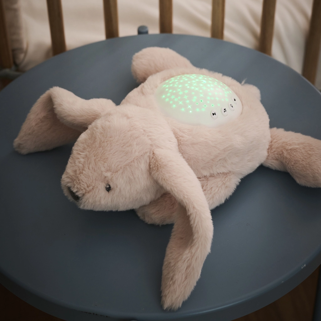 NATTou muzyczny projektor z nocnym światłem w formie mięciutkiego beżowego króliczka to idealny towarzysz wieczornych rytuałów. Zapewnia delikatną projekcję gwiazdek w kilku kolorach i towarzyszy zasypianiu kołysankami oraz białym szumem. Bezpieczna technologia LED nie nagrzewa się, dlatego jest odpowiednia do pokojów dziecięcych.