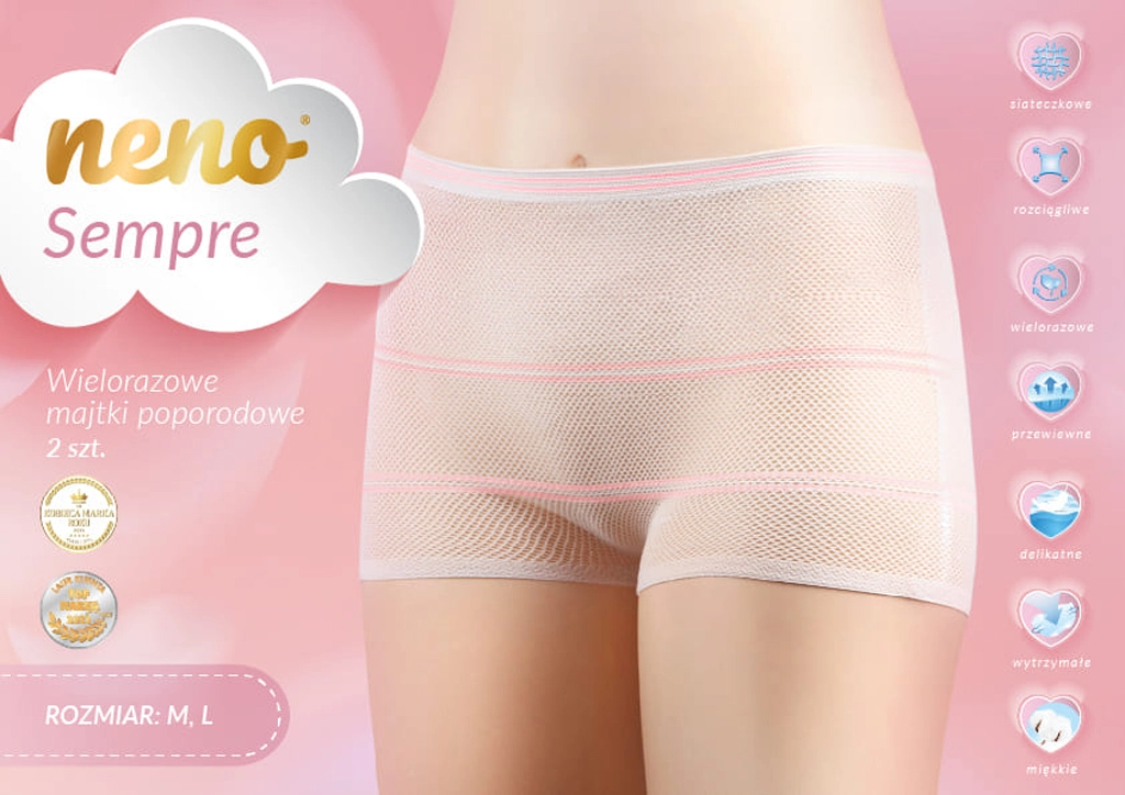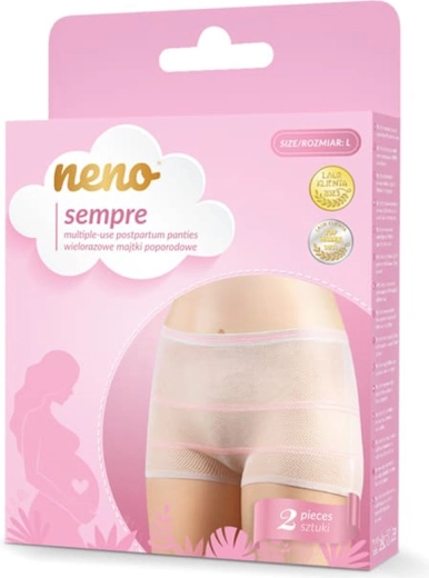 Poporodowe majtki Neno Sempre są oddychające, bezszwowe i delikatnie elastyczne, zapewniając codzienny komfort w okresie połogu. Niezawodnie utrzymują wkładki poporodowe, mają wysoki stan dla delikatnego osłonięcia blizny po cięciu cesarskim i można je używać wielokrotnie jako bardziej ekologiczną alternatywę dla jednorazowych majtek.