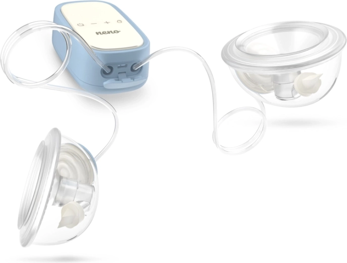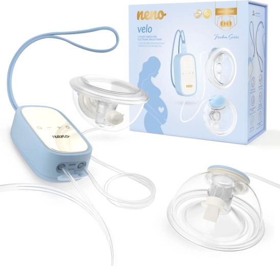 Ciesz się swobodą karmienia z laktatorem Neno Velo – kompaktowym bezprzewodowym hands‑free podwójnym laktatorem, który oferuje trójfazowe odciąganie z 8 poziomami mocy, delikatne silikonowe nakładki 24 mm z redukcją do 20 mm, cichą pracę, automatyczne wyłączenie po 30 min oraz do 120 minut działania na jednym ładowaniu.