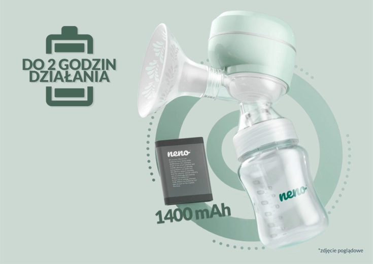 - Laktator Neno Uno, butelka na mleko ze smoczkiem i nakrętką, stojak na butelkę, 2× zawór, woreczki do przechowywania mleka, muszla 24 mm, osłona muszli, kabel USB‑C, instrukcja