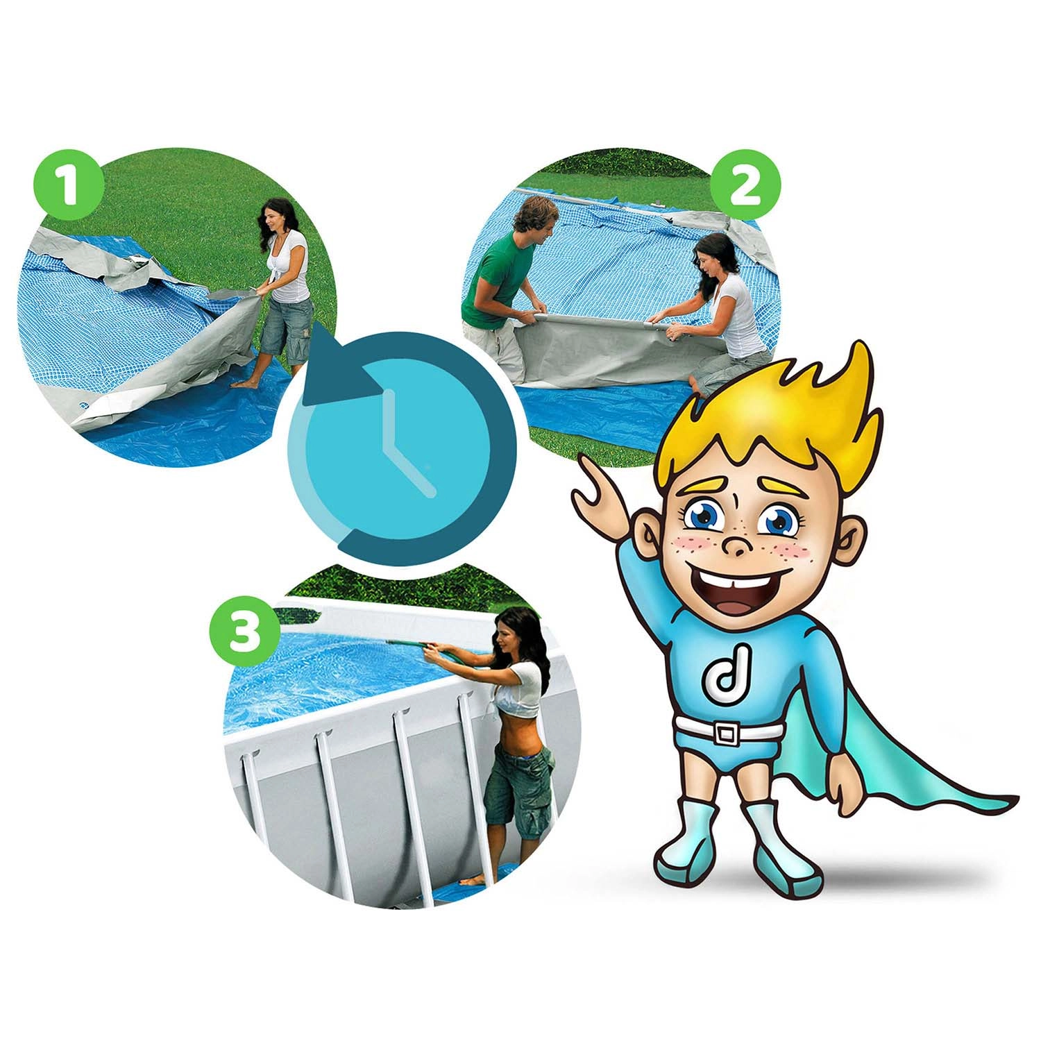 Solidny stalowy stelaż oraz 3-warstwowy materiał PVC z nylonowym wzmocnieniem zapewniają stabilność i długą żywotność. Pokrywa chroni przed zanieczyszczeniami, a dzięki macie zabezpieczysz dno i wodę.