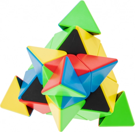 Ten łamigłówka jest wykonana z kolorowych plastikowych elementów, które łączą się, tworząc atrakcyjny kształt geometryczny.