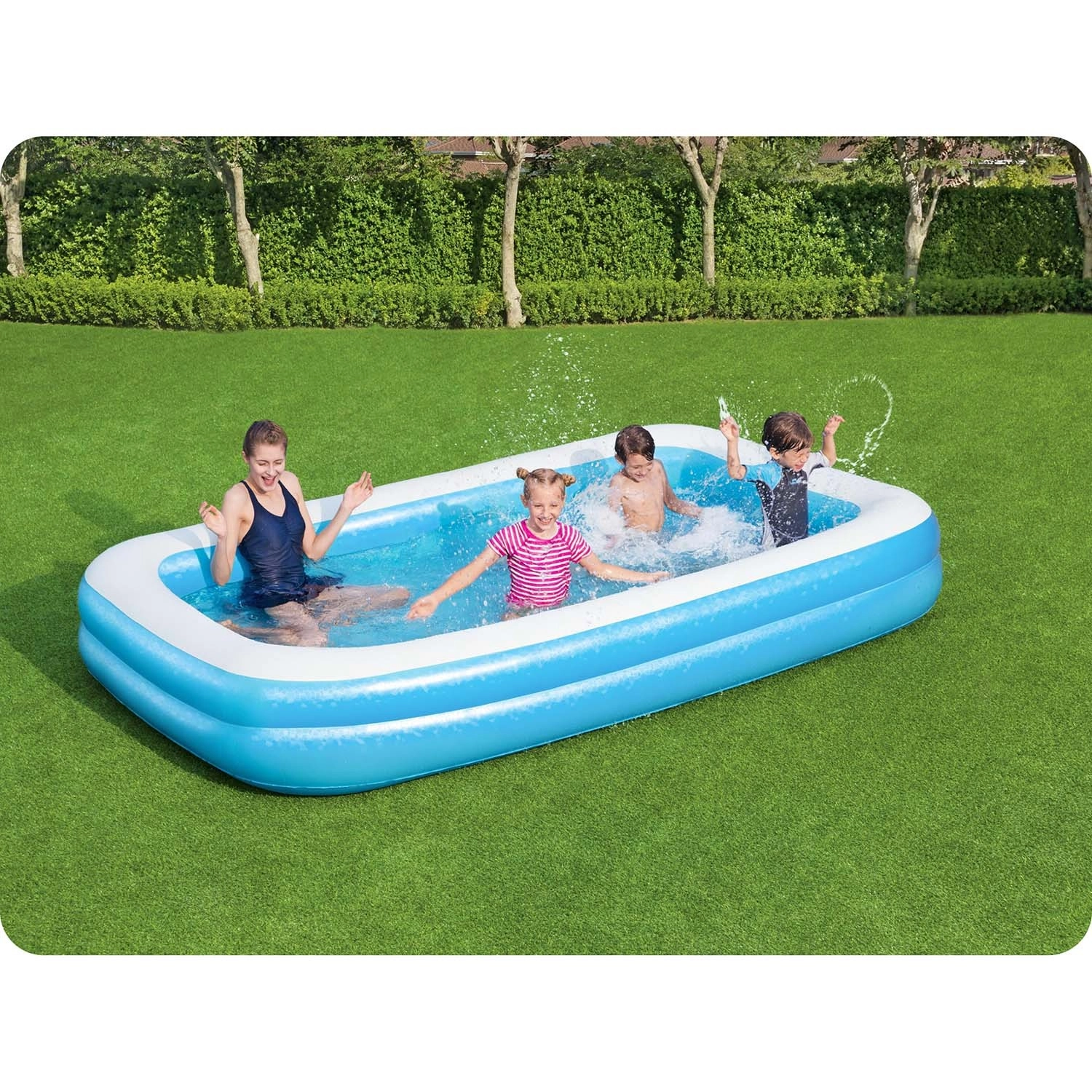 Wymiary 305 × 183 × 46 cm i pojemność 850 l zapewniają dużo miejsca na wodne zabawy dla dzieci i dorosłych.