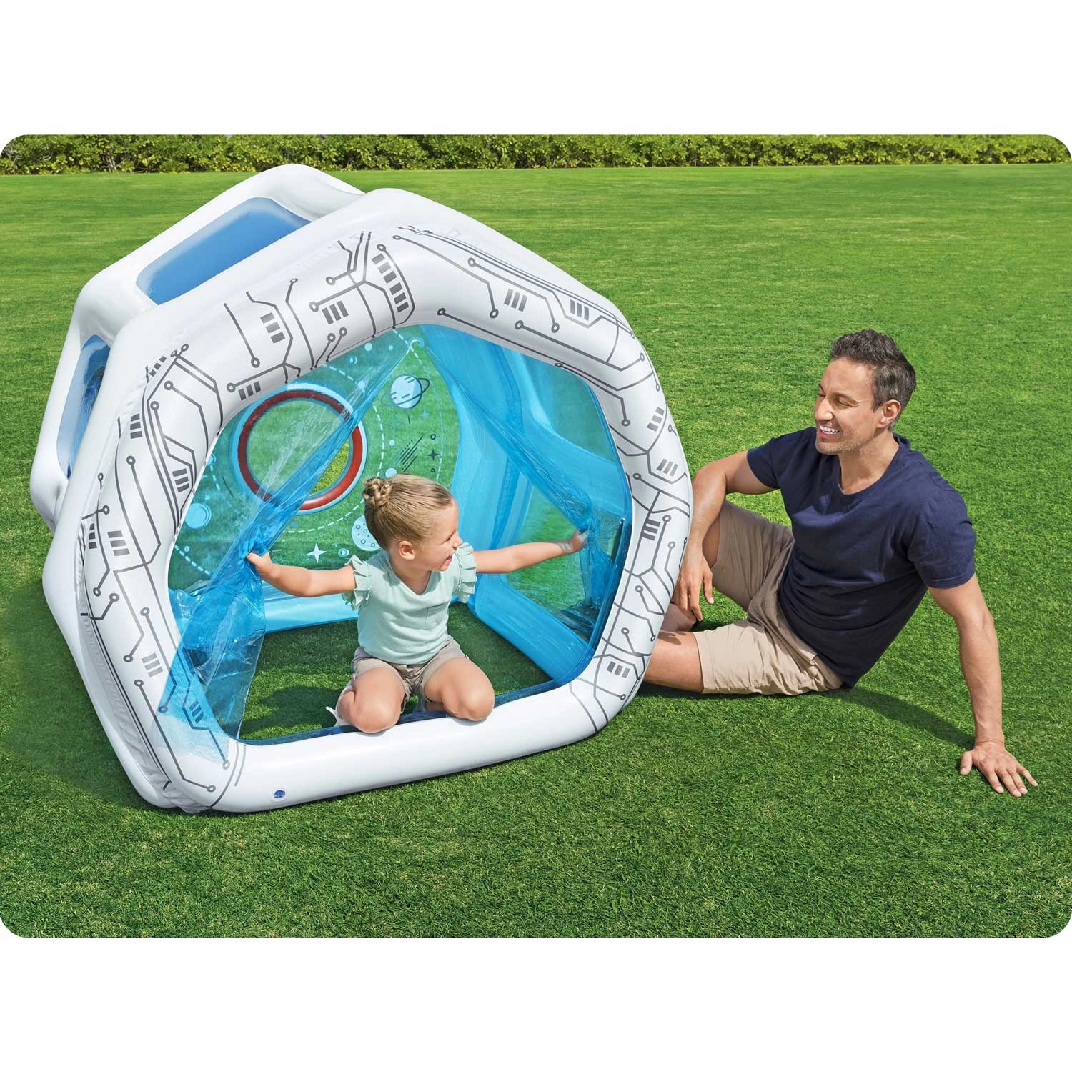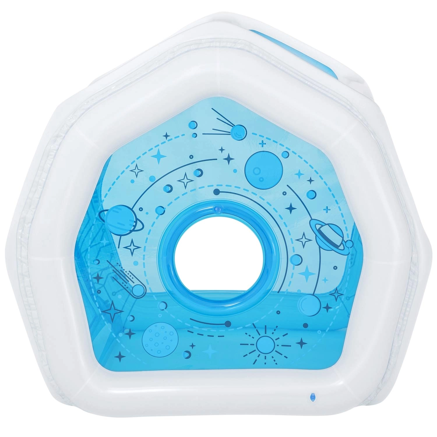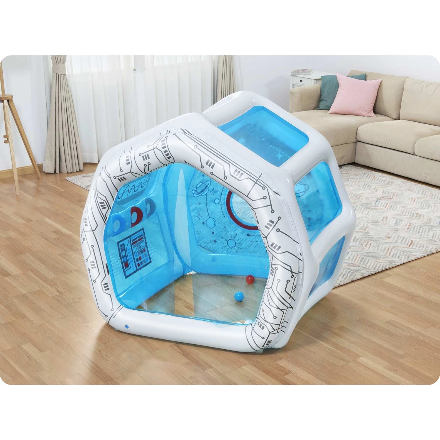 Nadmuchiwany plac zabaw Stacja kosmiczna oferuje dzieciom bezpieczne i inspirujące miejsce do zabawy, chowania się i odkrywania. Dzięki przezroczystym panelom rodzice mają doskonały podgląd, a miękkie nadmuchiwane ścianki zwiększają bezpieczeństwo podczas aktywnej zabawy.