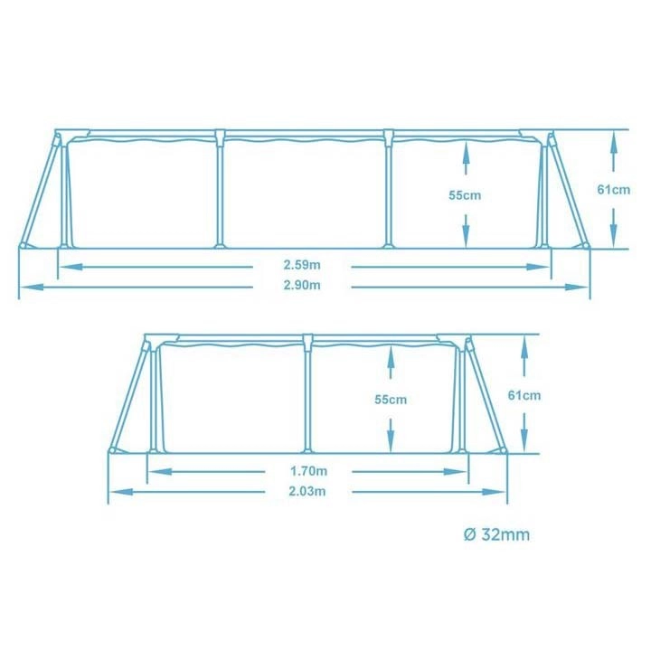 Konstrukcja Steel Pro z białą stalową ramą i wzmocnionymi narożnikami zapewnia solidność i długą żywotność. 3‑warstwowe PVC z nylonowym wzmocnieniem jest odporne na rozerwanie.
