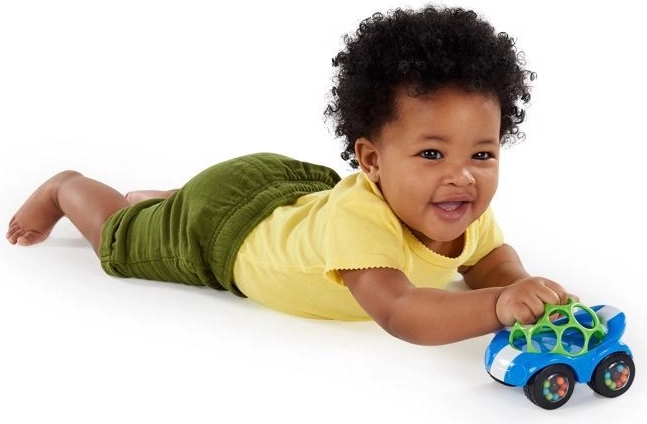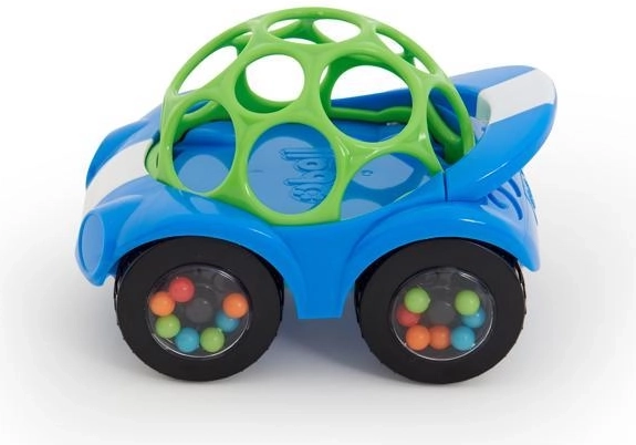 Niebieskie grzechoczące autko OBALL Rattle & Roll pobudza ciekawość i rozwija zmysły. Dzięki sprężystej siateczce OBALL dzieci łatwo je chwytają, potrząsają nim i wprawiają w ruch. Przezroczyste kółka z szerokimi komorami kryją kolorowe kuleczki, które podczas jazdy tworzą wesoły dźwięk – motywują do czołgania się, raczkowania i pierwszych kroczków.