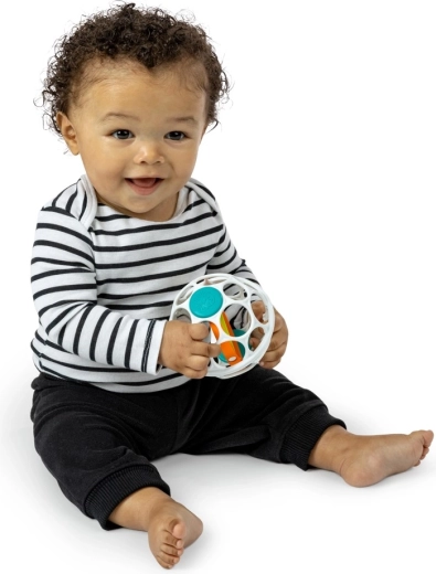 Lekka i elastyczna piłka OBALL Baby Einstein Grip & Spin została zaprojektowana tak, by małe rączki łatwo ją chwytały, ściskały i potrząsały. Otwarta, ażurowa konstrukcja wspiera naturalny chwyt, a wewnętrzne kolorowe elementy obracają się w ruchu, zapewniając atrakcyjną stymulację wzrokową i dźwiękową. Bezpieczne lusterko z postacią Roxy the Redbird wzbudza ciekawość i samoświadomość.