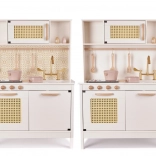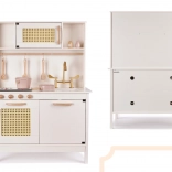 Stylowa dziecięca kuchnia w retro BOHO designie zapewnia godziny kreatywnej zabawy. Ma głęboki zlew ze złotym kranem, pokrętła, piekarnik z rattanowym panelem, praktyczne półki i szafki oraz bogate drewniane akcesoria. Dzięki świetlnym i dźwiękowym efektom palników zabawa jest realistyczna i rozwija wyobraźnię oraz małą motorykę.