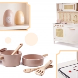 Ta drewniana kuchnia inspirowana stylem retro i boho zachwyca eleganckim połączeniem bieli, kremu i złotych detali. Większość elementów wykonana jest z drewna/MDF, a powierzchnia jest gładko wyszlifowana i pomalowana nietoksycznymi farbami dla bezpiecznej zabawy. Obrotowe pokrętła, otwierane drzwiczki i haczyki na akcesoria zachęcają do odkrywania i uczą dzieci porządku oraz organizacji.