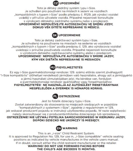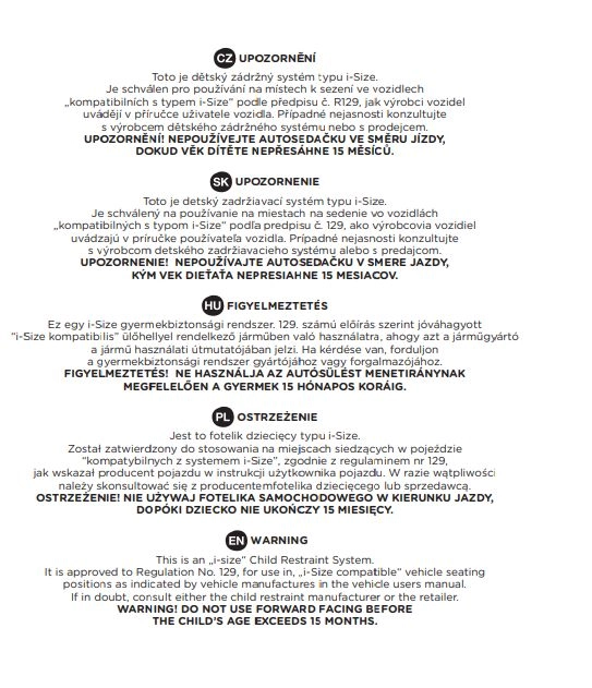 Spełnia rygorystyczną normę ECE R129 (i‑Size) i oferuje zaawansowaną ochronę boczną. Dla młodszych dzieci (40–105 cm) przewidziany jest montaż tyłem do kierunku jazdy z 5‑punktowymi pasami; dla starszych (100–150 cm) stosuje się prowadzenie pasa samochodowego. Zdejmowana i nadająca się do prania tapicerka ułatwia pielęgnację i utrzymanie higieny fotelika.