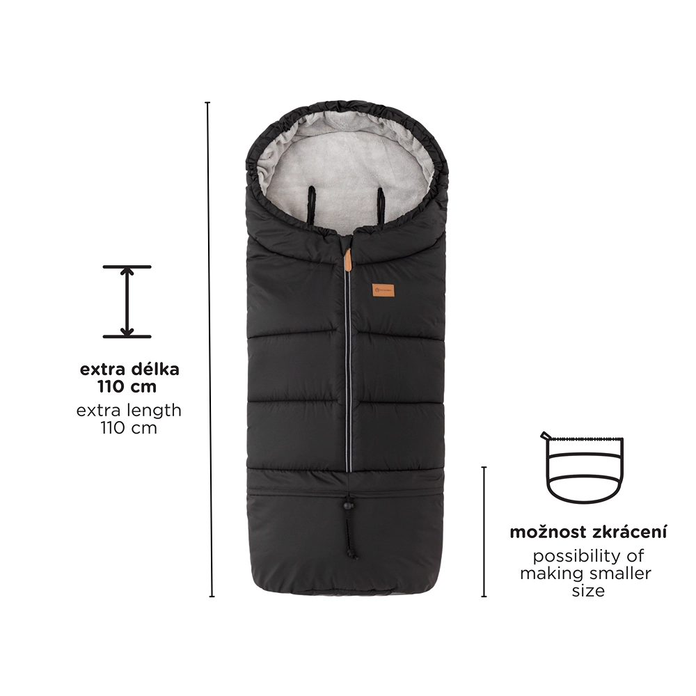 Po odpięciu osłony na nóżki zmniejszysz śpiworek do gondoli lub fotelika. Dolna część ma łatwą do utrzymania w czystości wyściółkę – idealną na buty.
