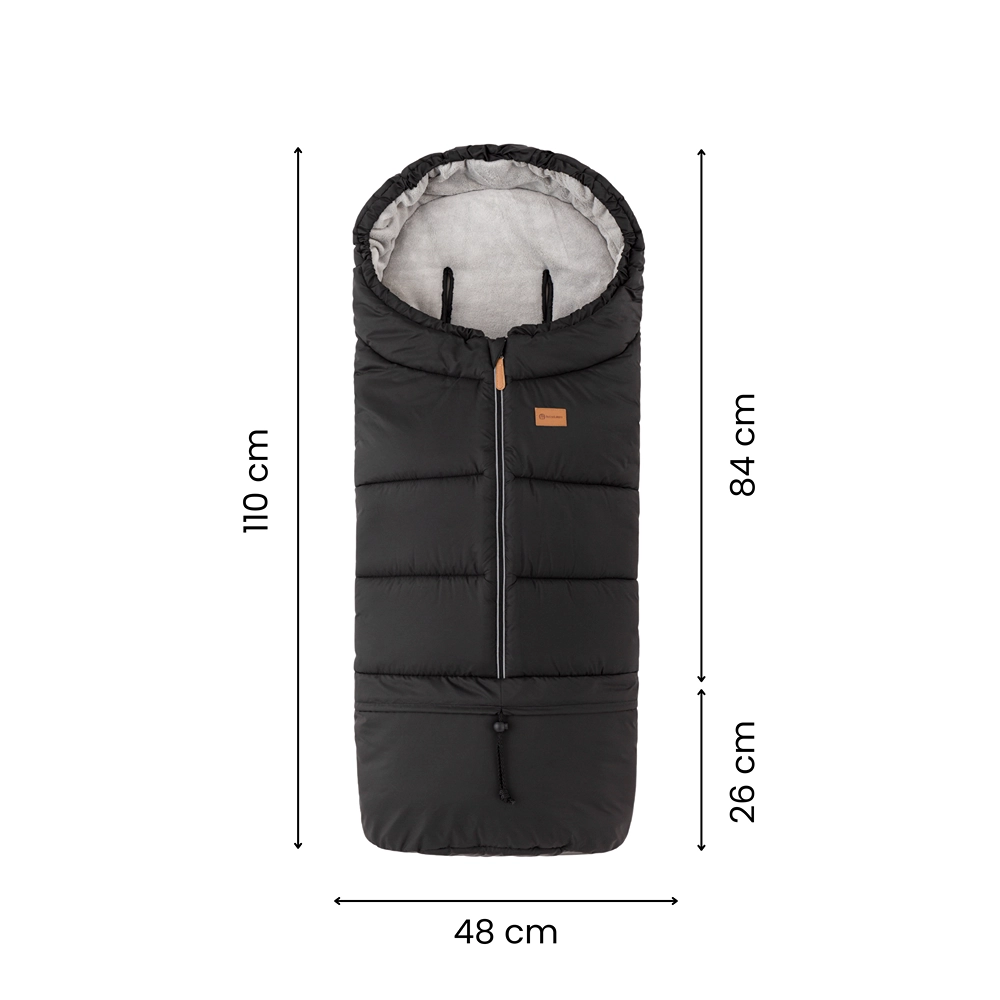 Przemyślane pionowe otwory na pasy bezpieczeństwa zapewniają szeroką kompatybilność z większością marek wózków. Antypoślizgowy tył (ABS) zapobiega przesuwaniu się śpiworka w siedzisku, a elementy odblaskowe zwiększają bezpieczeństwo przy słabej widoczności. Zamek pośrodku ułatwia szybki dostęp do dziecka, a dolna, łatwa do czyszczenia część jest praktyczna także przy butach.