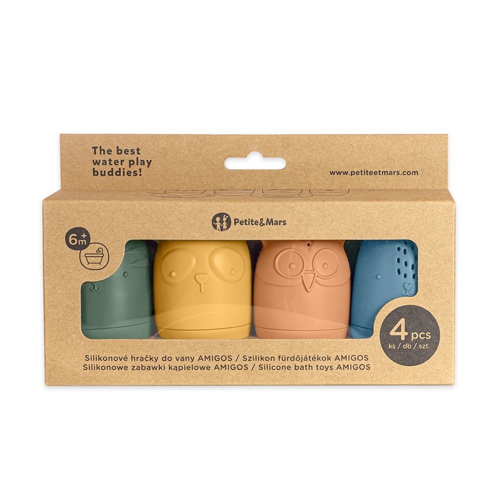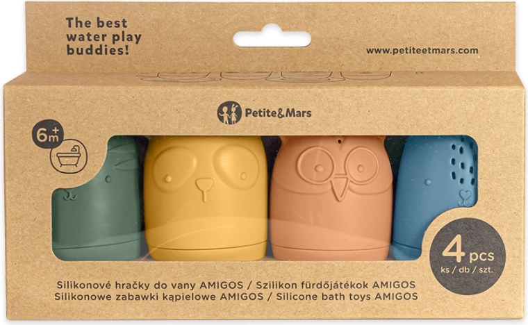 Zestaw Petite&Mars Amigos oferuje bezpieczną i kreatywną zabawę w wodzie dla dzieci od 6 miesięcy. Każda figurka po zanurzeniu napełnia się wodą i przez otwory w zabawny sposób ją rozpryskuje. Miękki silikon jest przyjemny w rączce, a ściskanie wzmacnia chwyt oraz koordynację ręka–oko.
