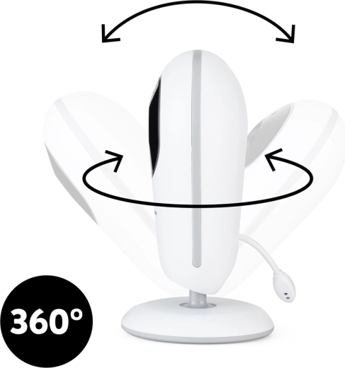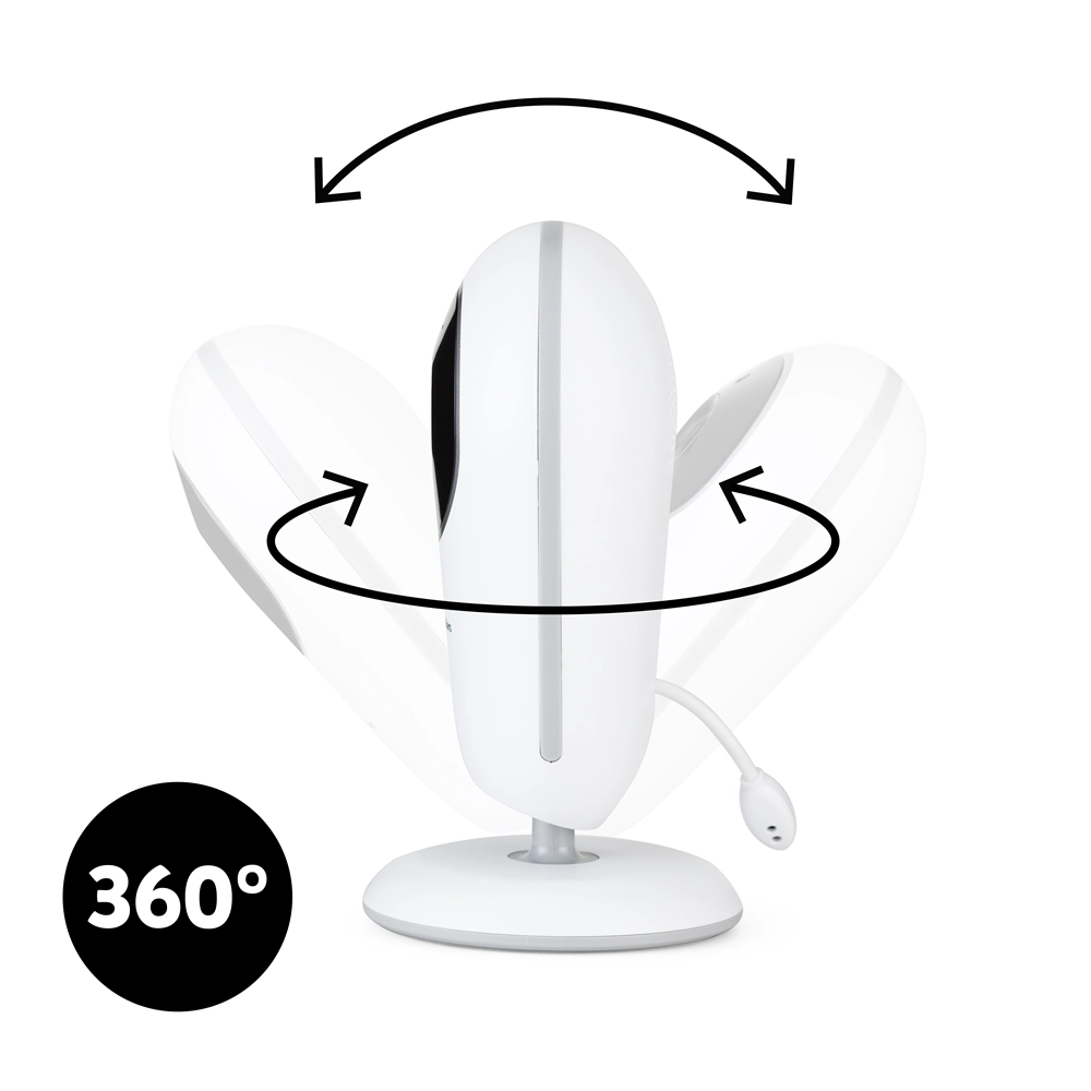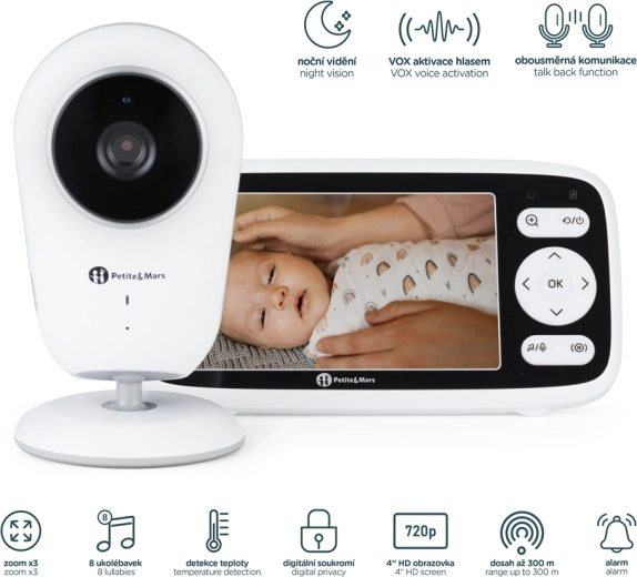 Aktywacja VOX oszczędza baterię, dwukierunkowe audio uspokoi dziecko Twoim głosem, pomiar temperatury dba o komfort, a 8 kołysanek z alarmem pomaga w codziennym rytmie.