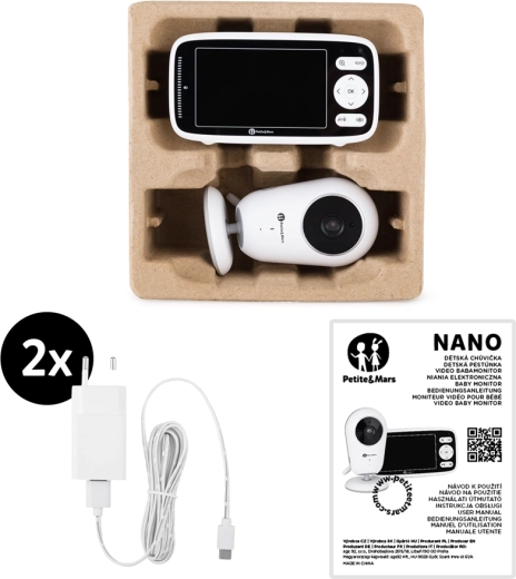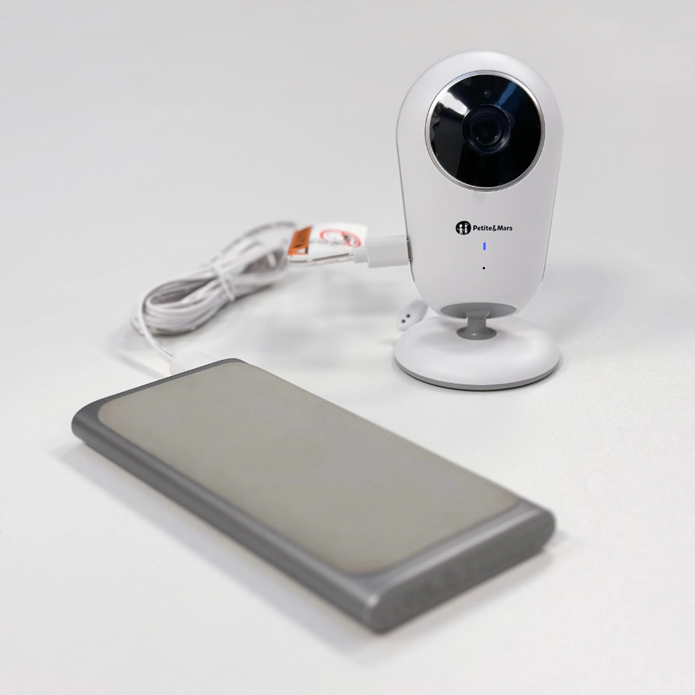 Jednostka rodzica ma wbudowany akumulator do pracy bezprzewodowej, kamera jest zasilana z sieci i może być używana także z powerbankiem dla elastyczności w podróży. Obsługiwane jest podłączenie do 4 kamer do nadzoru nad kilkoma pomieszczeniami.