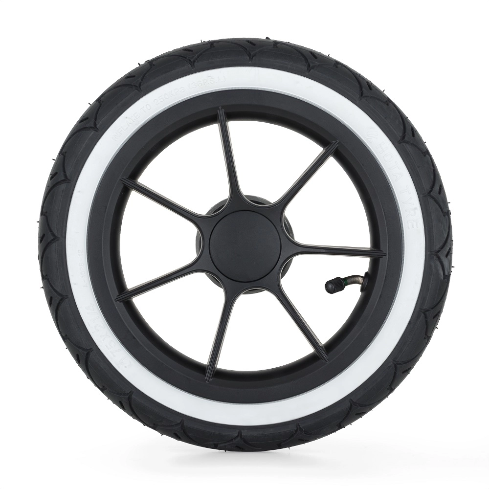 Duże przednie i tylne pompowane koła z doskonałą amortyzacją oraz możliwością blokady kół przednich zapewniają stabilność i komfort także na nierównym podłożu.
