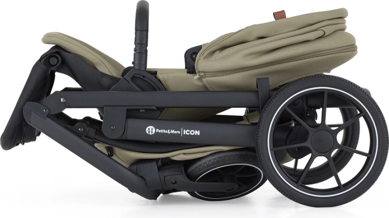 - Rama, 2× przednie i 2× tylne koło, gondola z osłoną, siedzisko spacerowe, kosz zakupowy, adaptery Maxi-Cosi, fotelik Petite&Mars Core, baza Core Pro i-Size
