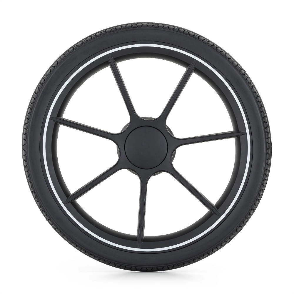 Duże gumowe koła z amortyzacją i blokadą kół przednich poradzą sobie zarówno w mieście, jak i na parkowych alejkach. Stabilna rama gwarantuje płynną jazdę i pewne prowadzenie.