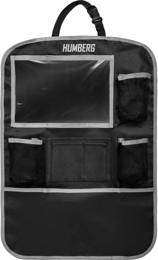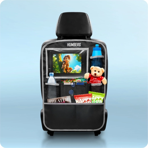 Zamień chaos na tylnych siedzeniach w przejrzysty porządek. Organizer samochodowy HUMBERG oferuje sprytny układ kieszeni, dzięki czemu tablet, butelki, przekąski i zabawki są zawsze pod ręką. Dzięki przezroczystej, dotykowej folii dzieci mogą obsługiwać tablet bez wyjmowania go z kieszeni – idealnie na długie trasy.