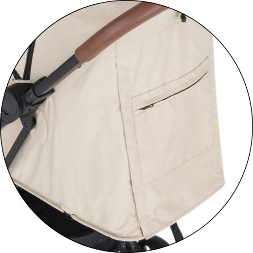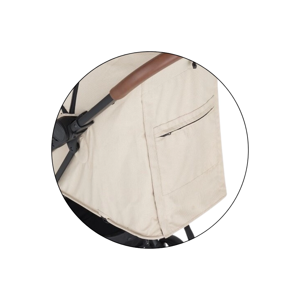 Przestronna wydłużana budka z daszkiem skutecznie chroni przed słońcem i wiatrem. W upały docenisz siatkowe okienko w budce oraz dużą tylną wentylacyjną siatkę po zwinięciu pokrycia. Rodziców ucieszy odpinany pałąk dla szybkiego dostępu do dziecka, rączki z eko‑skóry dla wygodnego chwytu, praktyczna tylna kieszeń na drobiazgi oraz pojemny kosz zakupowy. W zestawie znajduje się także uchwyt na napoje.