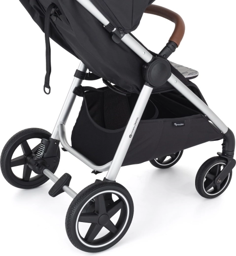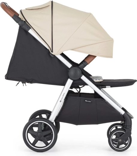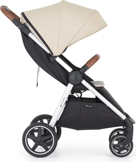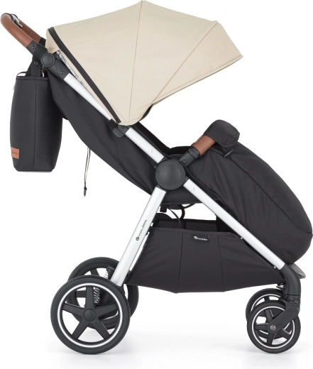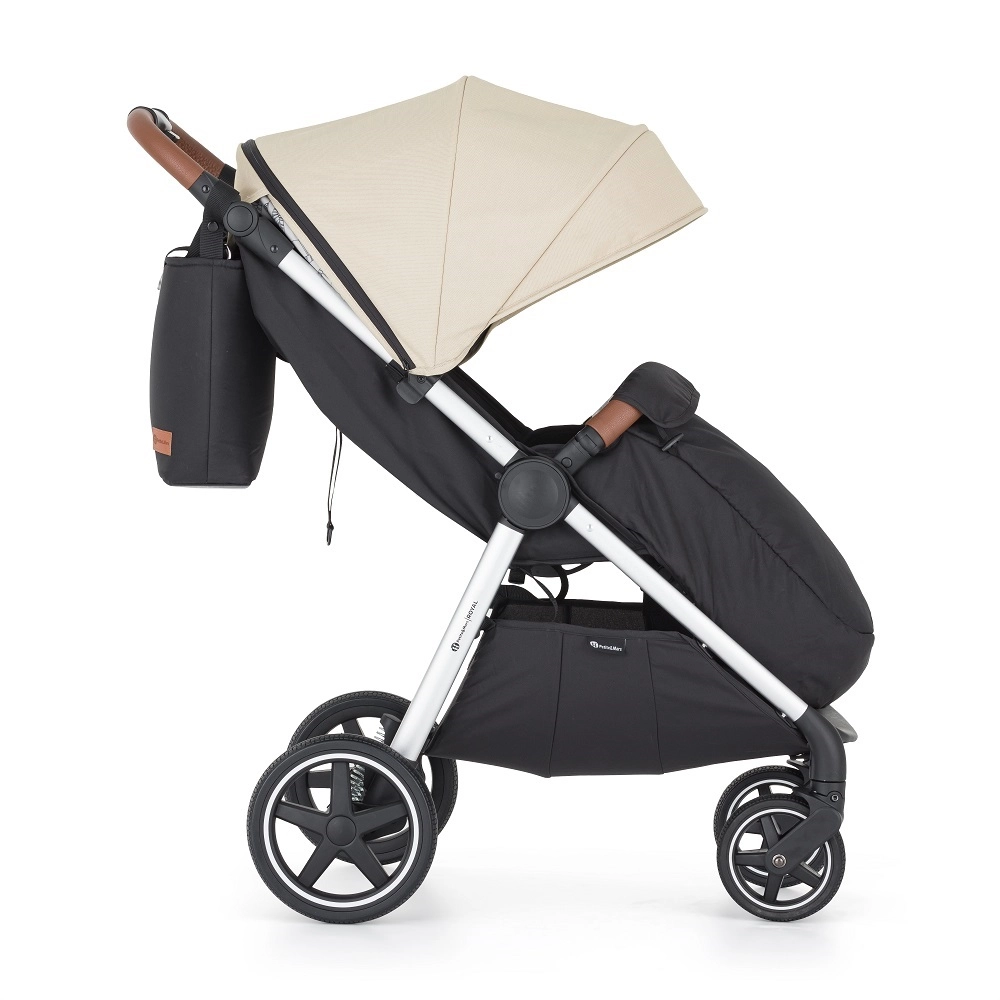 Dla maksymalnego komfortu wózek ma długie oparcie pleców, płynną regulację aż niemal do pozycji leżącej oraz przedłużaną budkę z daszkiem i SPF 50 ze stylową podszewką. Praktyczne wyposażenie uzupełnia pojemny kosz zakupowy, torba do przewijania i pokrowiec na nóżki. Tapicerka z powłoką wodoodporną oraz składanie do wewnątrz pomagają utrzymać wózek w czystości.