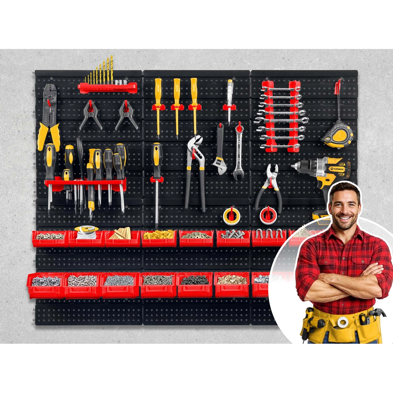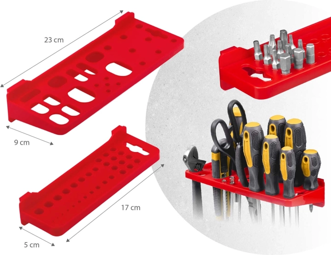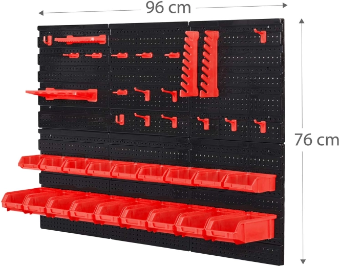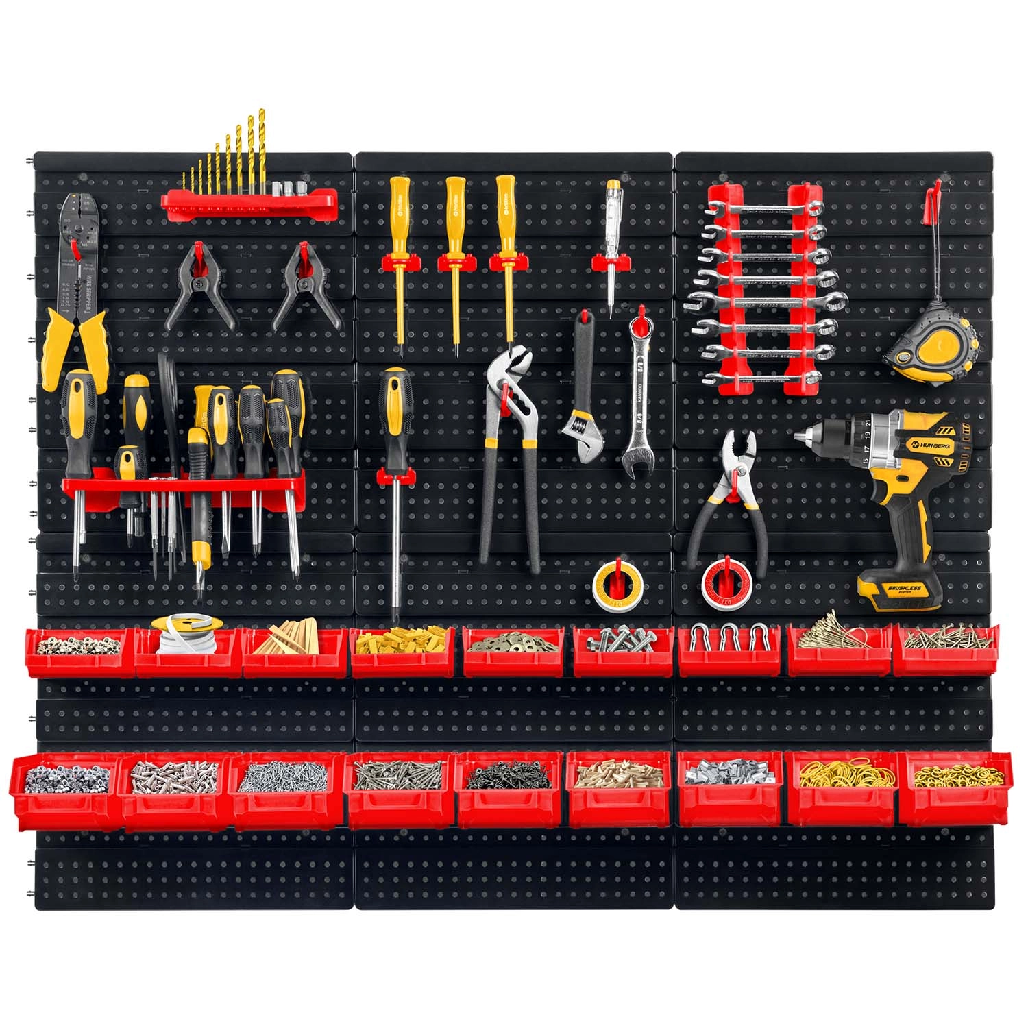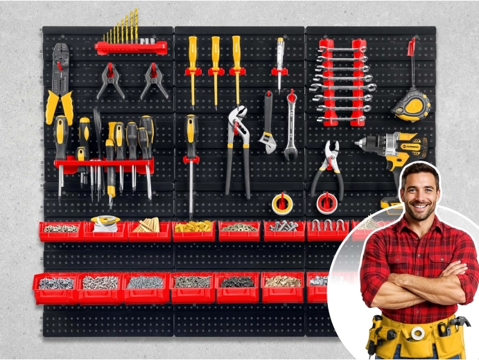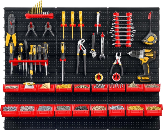 Kompletny ścienny organizer HUMBERG to niezbędny pomocnik dla każdego serwisu i domowego garażu. Dzięki modułowemu systemowi perforowanych paneli łatwo ułożysz rozmieszczenie dokładnie według swoich potrzeb. Solidne haki, uchwyty i półki utrzymają wkrętaki, szczypce i klucze, a kuwety w różnych rozmiarach przejrzyście posegregują elementy złączne.