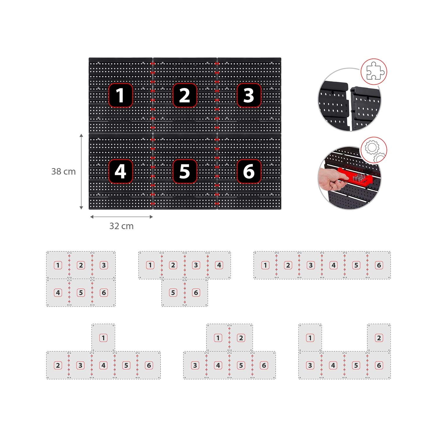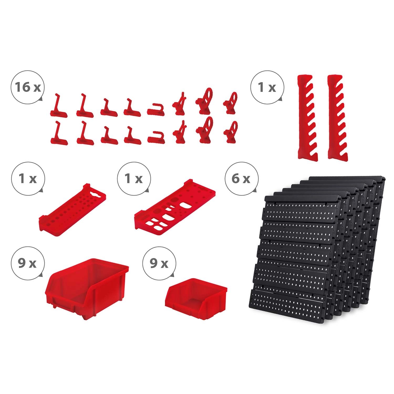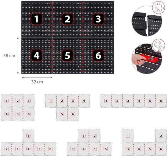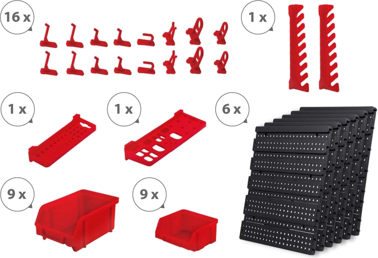 W zestawie znajduje się duży komplet akcesoriów: 6 modułowych paneli i łącznie 43 elementy – 18 kuwet (9 małych 9,5 × 10 × 5 cm i 9 dużych 16 × 10 × 7,3 cm), 2 półki odkładcze (23 × 9 cm i 17 × 5 cm), 16 haków i uchwytów oraz 1 zestaw uchwytów na klucze. Uniwersalne kołki do montażu w betonie, cegle, drewnie i blasze znajdują się w opakowaniu.