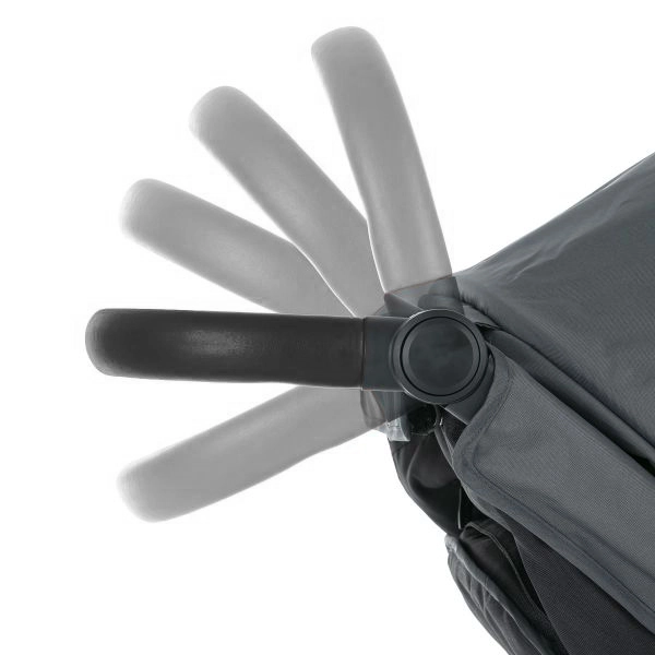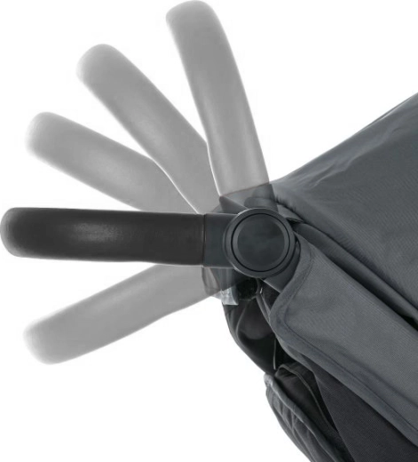Regulowana wysokość rączki, odpinany pałąk z eko skóry oraz regulacja oparcia i podnóżka niemal do leżenia dla spokojnego snu.