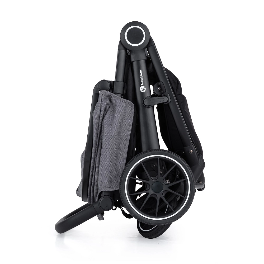 Szybkie i kompaktowe złożenie ułatwia obsługę w domu i w podróży. Wózek stoi po złożeniu i oszczędza miejsce.