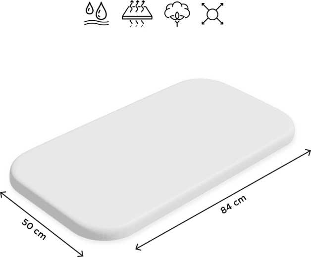 Praktyczne i wygodne prześcieradło z gumką dla niemowląt o wymiarach 84 × 50 cm. Dzięki nieprzemakalnej warstwie chroni materac przed wilgocią, miękki bawełniany dżersej jest przyjemny w dotyku i oddychający. Z gumką dookoła doskonale trzyma się materaca i można je prać w temperaturze do 95 °C dla maksymalnej higieny.