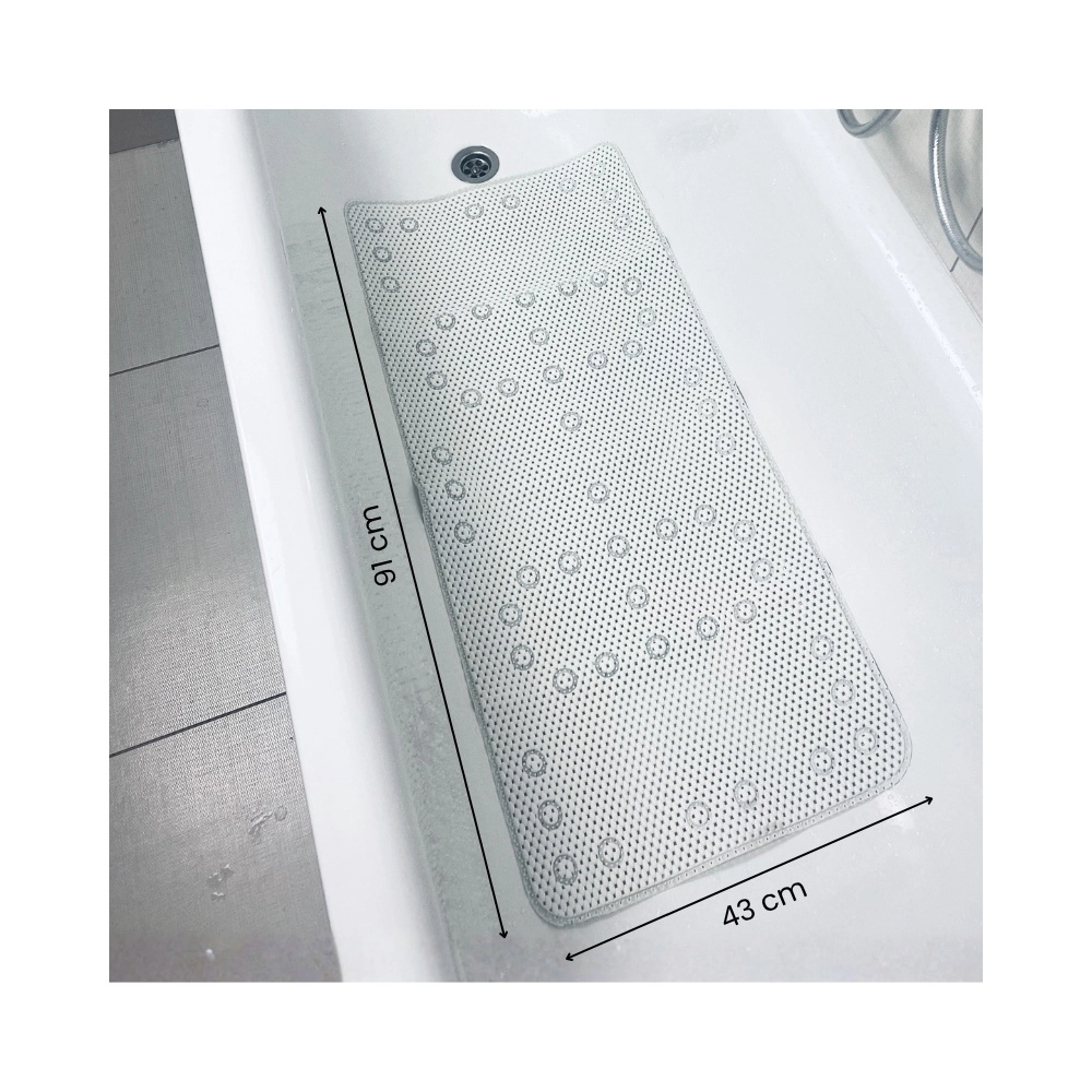 Wymiary 91 × 43 cm pokrywają niemal całe dno wanny i zapewniają stabilne oparcie dzieciom i dorosłym podczas kąpieli lub prysznica.