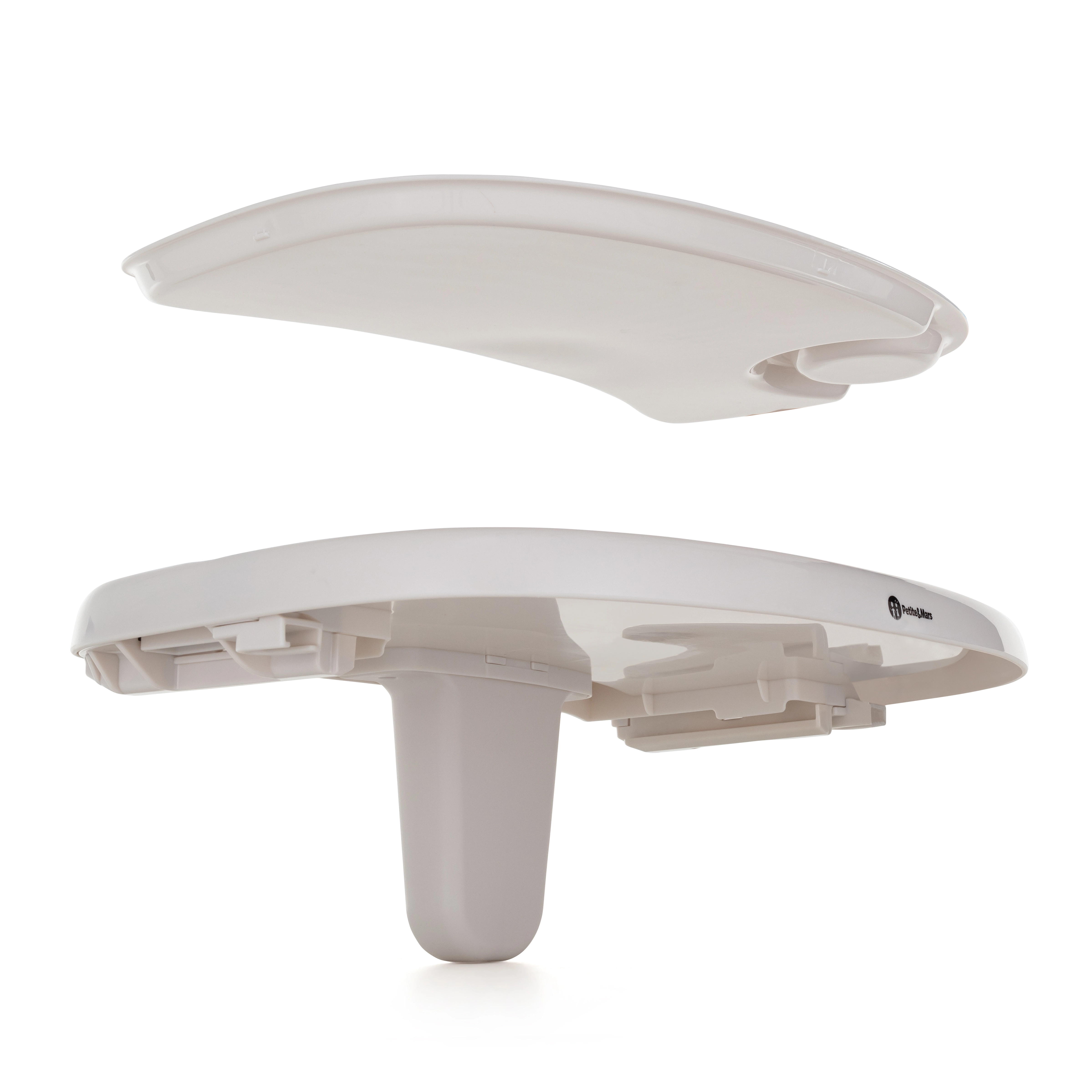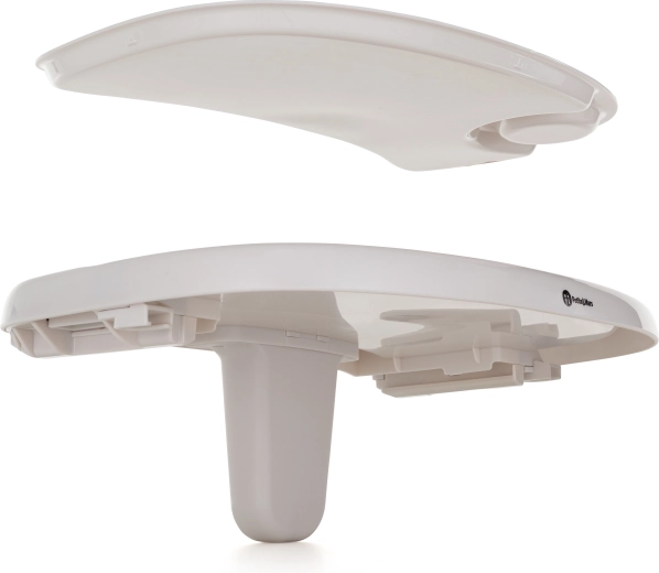 Szeroka tacka składa się z dolnej oraz profilowanej górnej części z miejscem na kubek; górny element można myć w zmywarce.