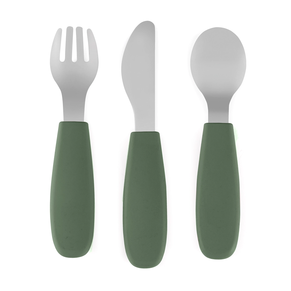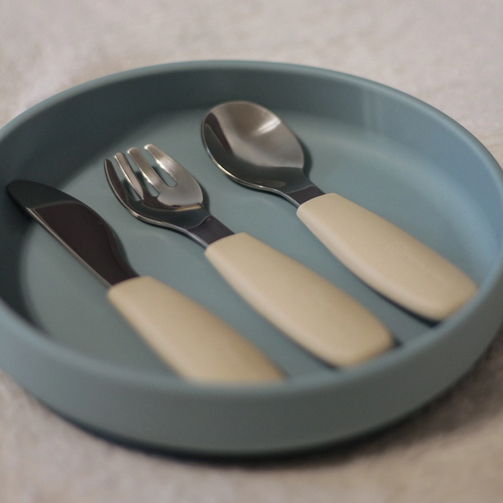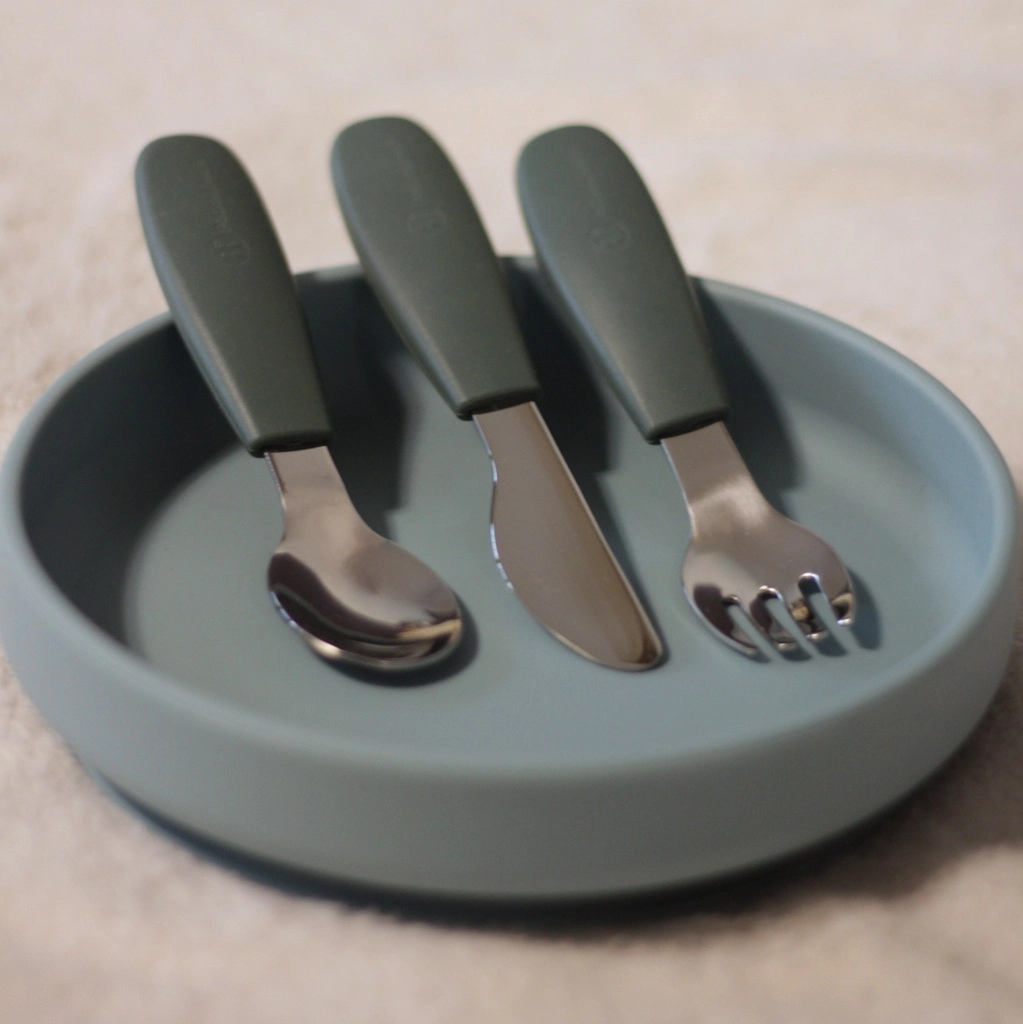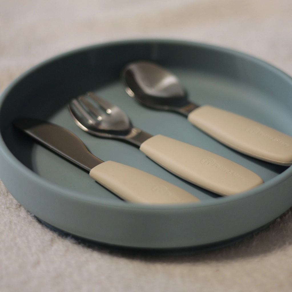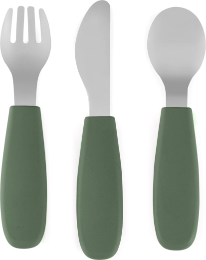 Stylowy zestaw dziecięcych sztućców PETITE&MARS dla dzieci od 12 miesięcy wspiera samodzielne jedzenie. Zawiera łyżeczkę, widelec i bezpieczny nóż ze stali nierdzewnej z ergonomicznymi silikonowymi uchwytami. Antypoślizgowy chwyt, zaokrąglone krawędzie i łatwe czyszczenie w zmywarce sprawiają, że ten zestaw to praktyczny wybór na co dzień. Doskonale współgra z kolekcją TAKE&MATCH w kolorze Misty Green.