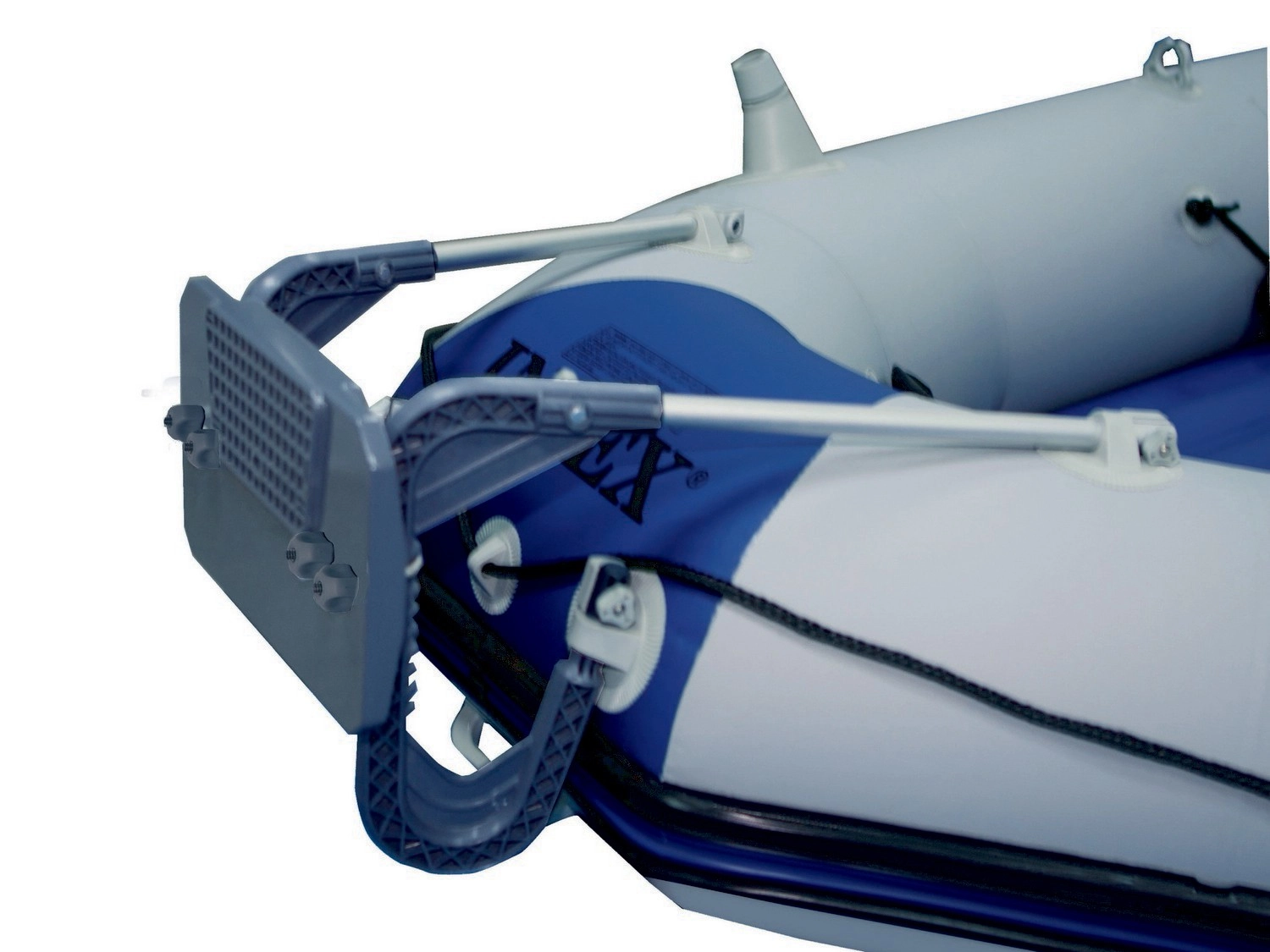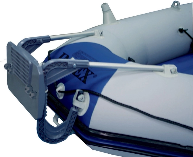 Uniwersalny uchwyt silnika do łodzi Intex z wytrzymałą plastikową płytą i aluminiową ramą umożliwia łatwy i szybki montaż. Odpowiedni do silników elektrycznych oraz spalinowych do 3 KM, kompatybilny z wybranymi dmuchanymi łodziami INTEX. Idealne rozwiązanie dla stabilnego i bezpiecznego mocowania silnika.