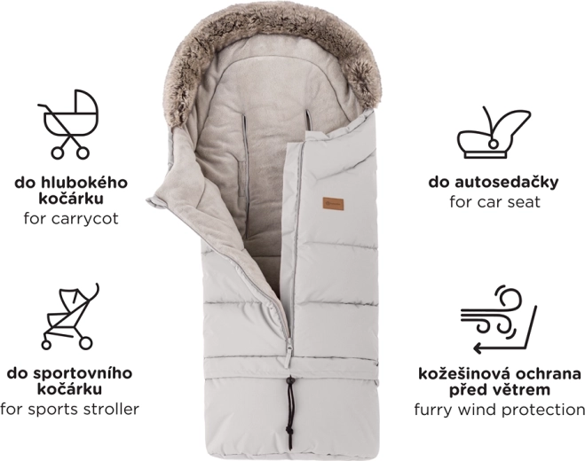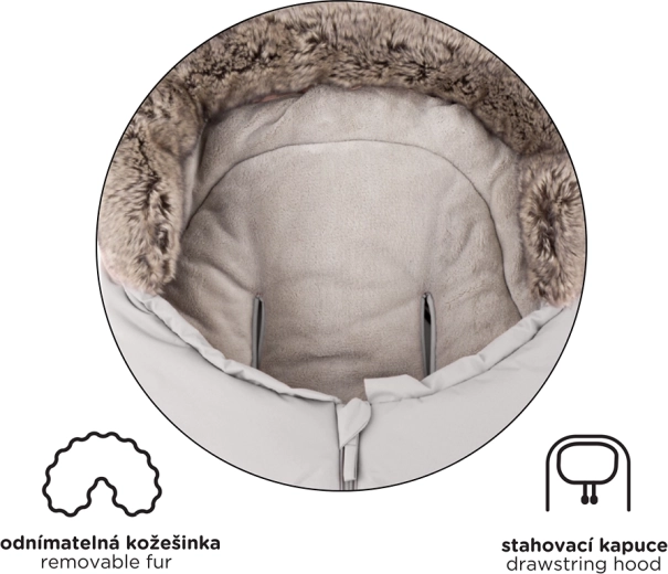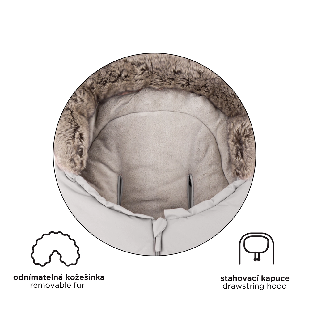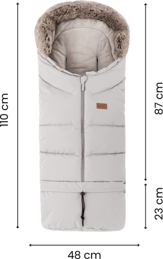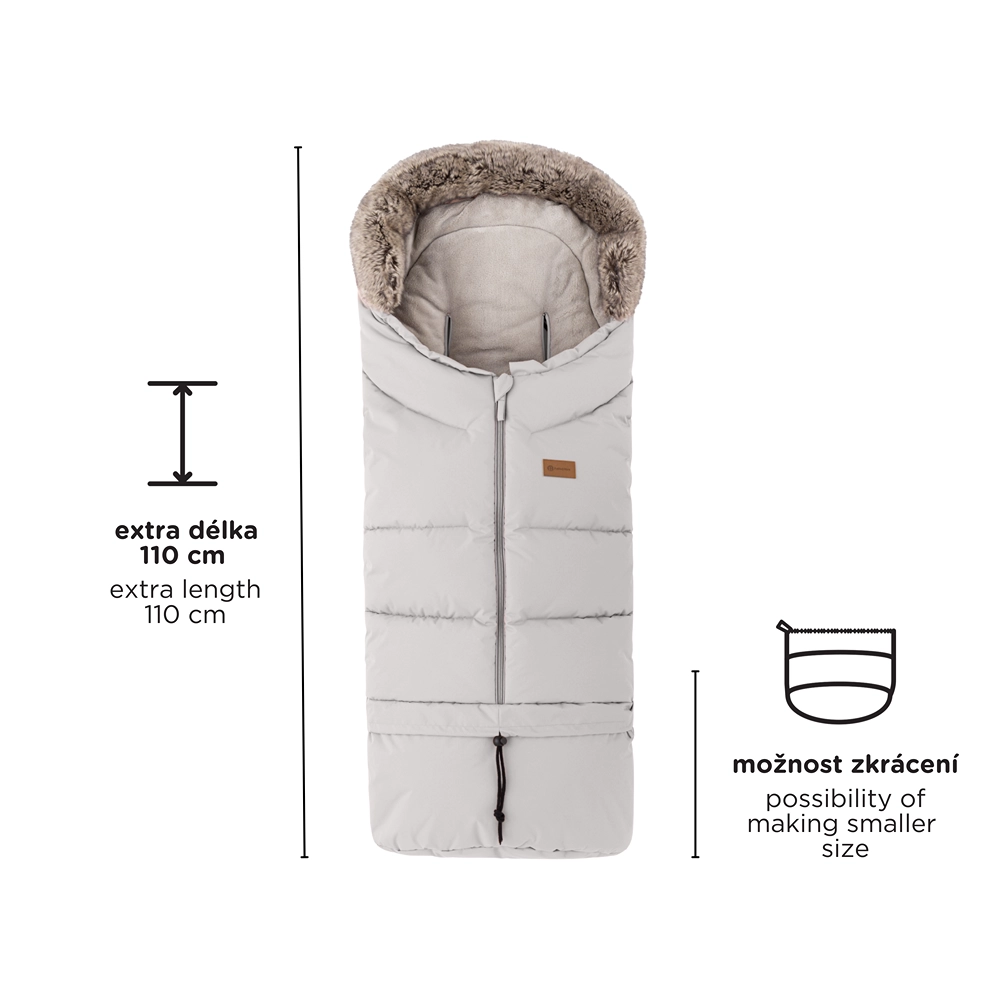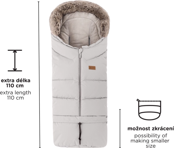 Śpiworek łatwo skrócisz, odpinając dolną część do gondoli lub fotelika samochodowego; w pełnej długości 110 cm jest idealny do wózka spacerowego. Futrzany kołnierz działa jako osłona przed wiatrem.