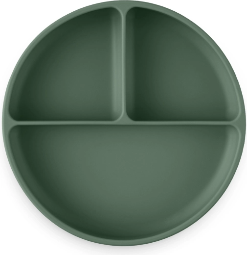 Okrągły silikonowy talerz z przyssawką dla dzieci od 6 miesięcy ułatwia samodzielne jedzenie. Ma trzy przegródki dla przejrzystego serwowania, wykonany jest z bezpiecznego silikonu spożywczego bez BPA, można go myć w zmywarce i używać w mikrofalówce, a dzięki antypoślizgowej przyssawce stabilnie trzyma się gładkiej powierzchni.