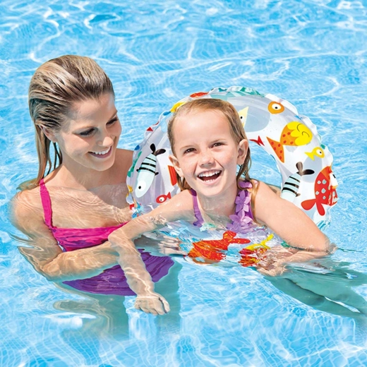 Dmuchane koło do wody INTEX z wesołymi letnimi nadrukami to świetny wybór na pierwsze wodne przygody. Dzięki kompaktowym wymiarom i niskiej wadze łatwo mieści się w plecaku, szybko się pompuje i jest gotowe do użycia w mgnieniu oka. Wytrzymały materiał PVC poradzi sobie z typowymi dziecięcymi zabawami nad wodą.