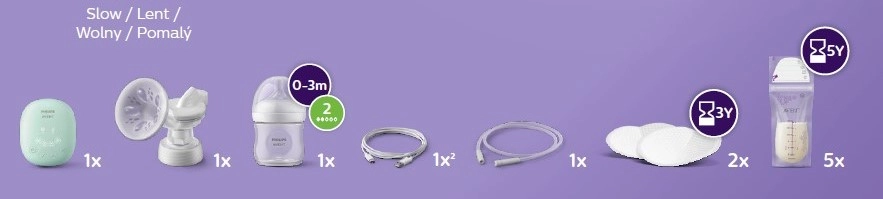 - Jednostka silnikowa, silikonowa rurka, przewód USB‑C, zestaw odciągający z wkładką, butelka Natural 125 ml, smoczek o wolnym przepływie (1 szt.), płytka zamykająca (1 szt.), zakrętka, woreczki na mleko (5 szt.), wkładki laktacyjne (4 szt.)