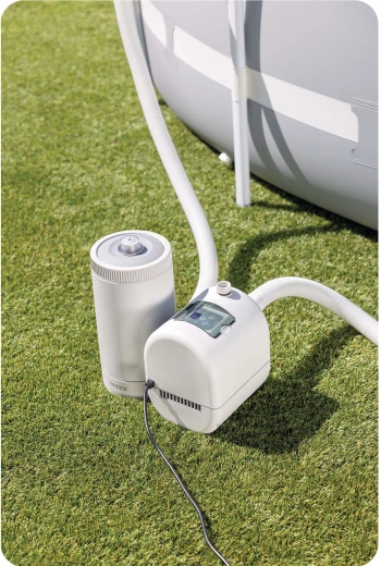 Kompaktowa jednostka z wężami i złączkami szybko podłącza się do basenu i zapewnia niezawodną cyrkulację.