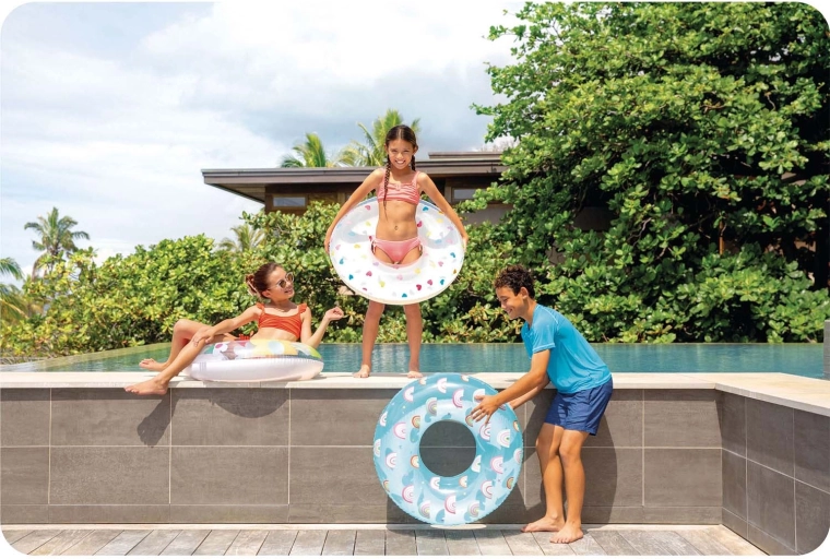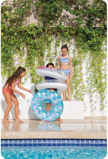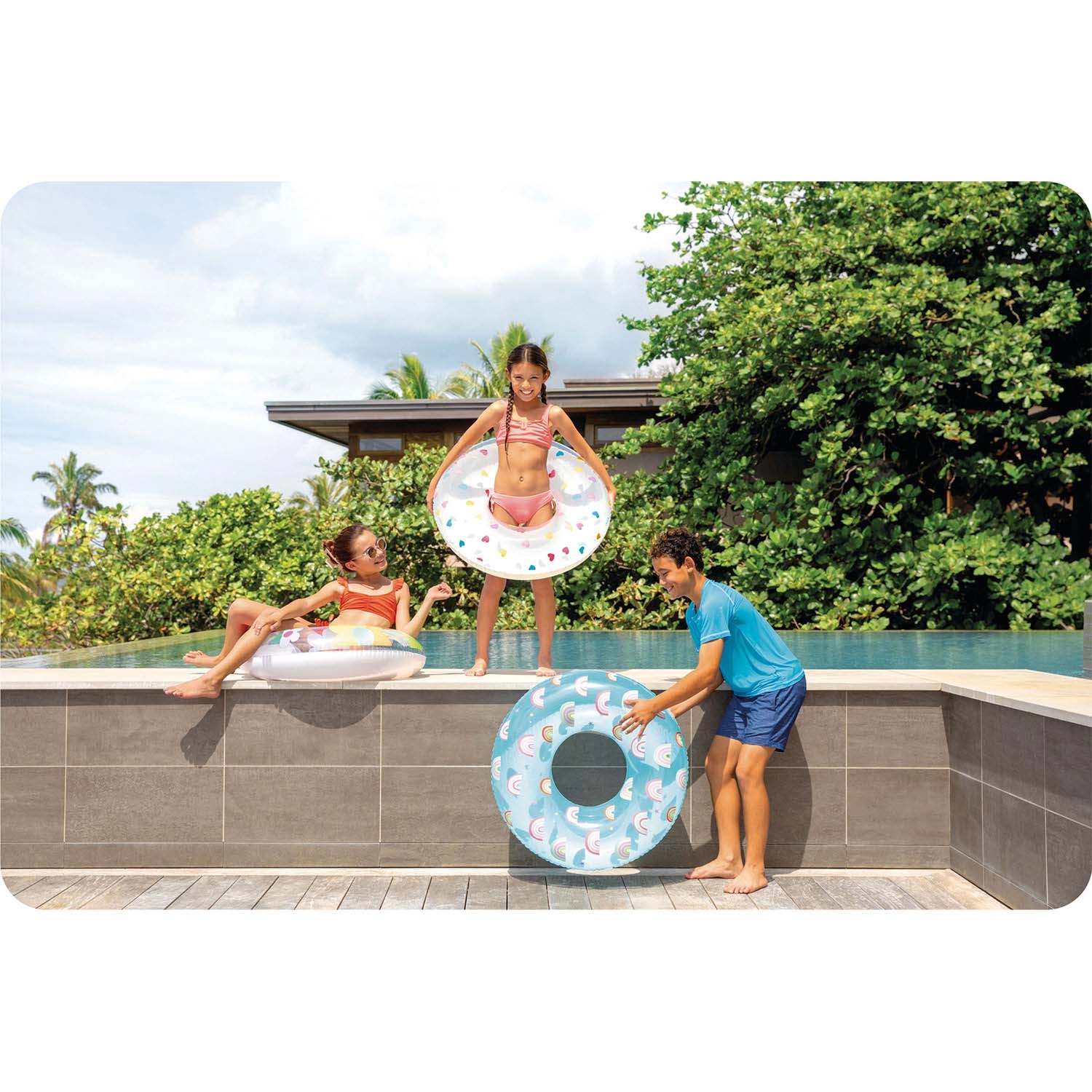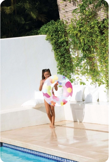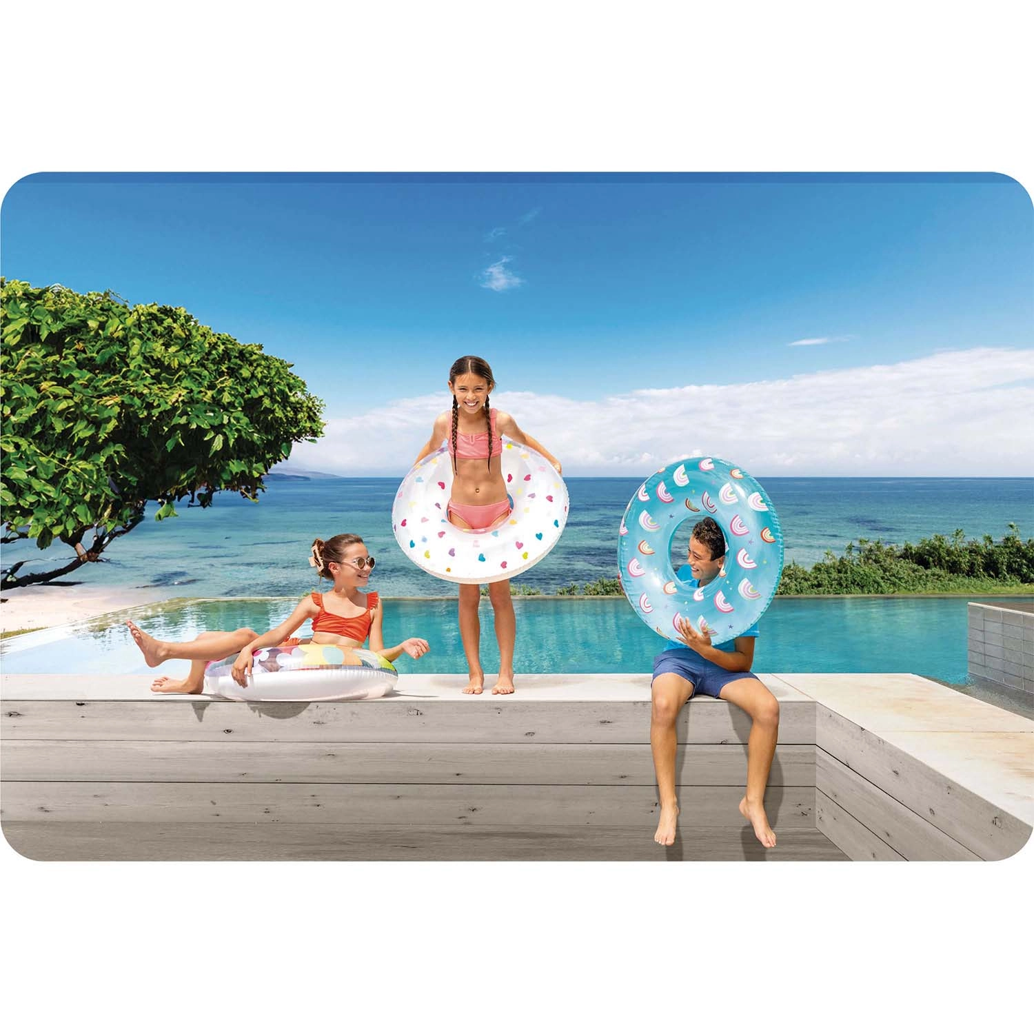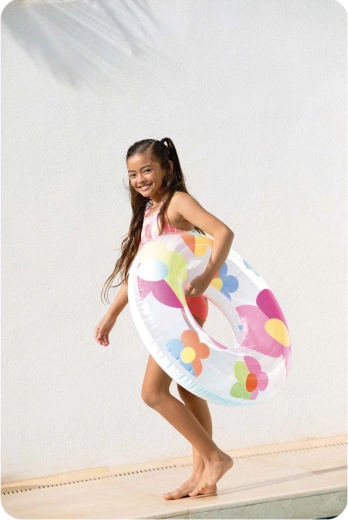 Stylowe koło pływackie INTEX z kolorowymi kwiatami zapewnia mnóstwo zabawy i relaksu na wodzie. Przezroczysto-białe wykończenie z intensywnymi kolorami jest świetnie widoczne i doskonale prezentuje się na letnich zdjęciach. Dzięki wysokiej jakości PVC o grubości 0,2 mm koło jest lekkie, a jednocześnie odporne na drobne otarcia.