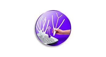 Stojak do suszenia Philips Avent został zaprojektowany, aby zapewnić szybkie i uporządkowane suszenie wszystkich codziennych akcesoriów do karmienia dziecka. Dzięki sprytnemu rozmieszczeniu kołków mieści do 8 butelek, smoczki, pierścienie, części laktatora i inne dodatki. Wyjmowana tacka zbiera skapującą wodę i utrzymuje powierzchnię roboczą suchą oraz czystą.