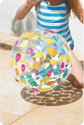 Nadmuchiwana plażowa piłka z motywem wesołych rybek jest idealna do zabaw przy basenie, na plaży i w ogrodzie. Dzięki wytrzymałemu PVC i wieloczęściowej konstrukcji dobrze trzyma kształt, łatwo się pompuje, a po spuszczeniu powietrza zajmuje minimum miejsca w bagażu.