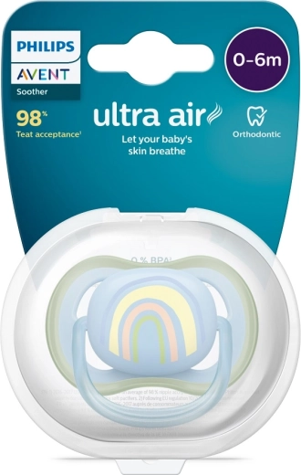 Smoczek Philips Avent Ultra Air został zaprojektowany, by łagodnie uspokajać i zapewniać maksymalny komfort wrażliwej skórze dziecka. Duże otwory wentylacyjne umożliwiają swobodny przepływ powietrza, dzięki czemu skóra mniej się poci i pozostaje spokojna. Ortodontyczny, symetryczny silikonowy smoczek jest miękki, neutralny w smaku i wspiera naturalny rozwój jamy ustnej.