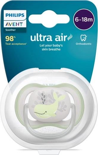 Smoczek Ultra Air został zaprojektowany z myślą o delikatnym uspokajaniu i maksymalnym komforcie na co dzień. Duże otwory wentylacyjne zapewniają swobodny przepływ powietrza, dzięki czemu wrażliwa skóra dziecka pozostaje suchsza i bez podrażnień. Lekka tarcza o ergonomicznym kształcie wygodnie leży i nie powoduje odcisków.